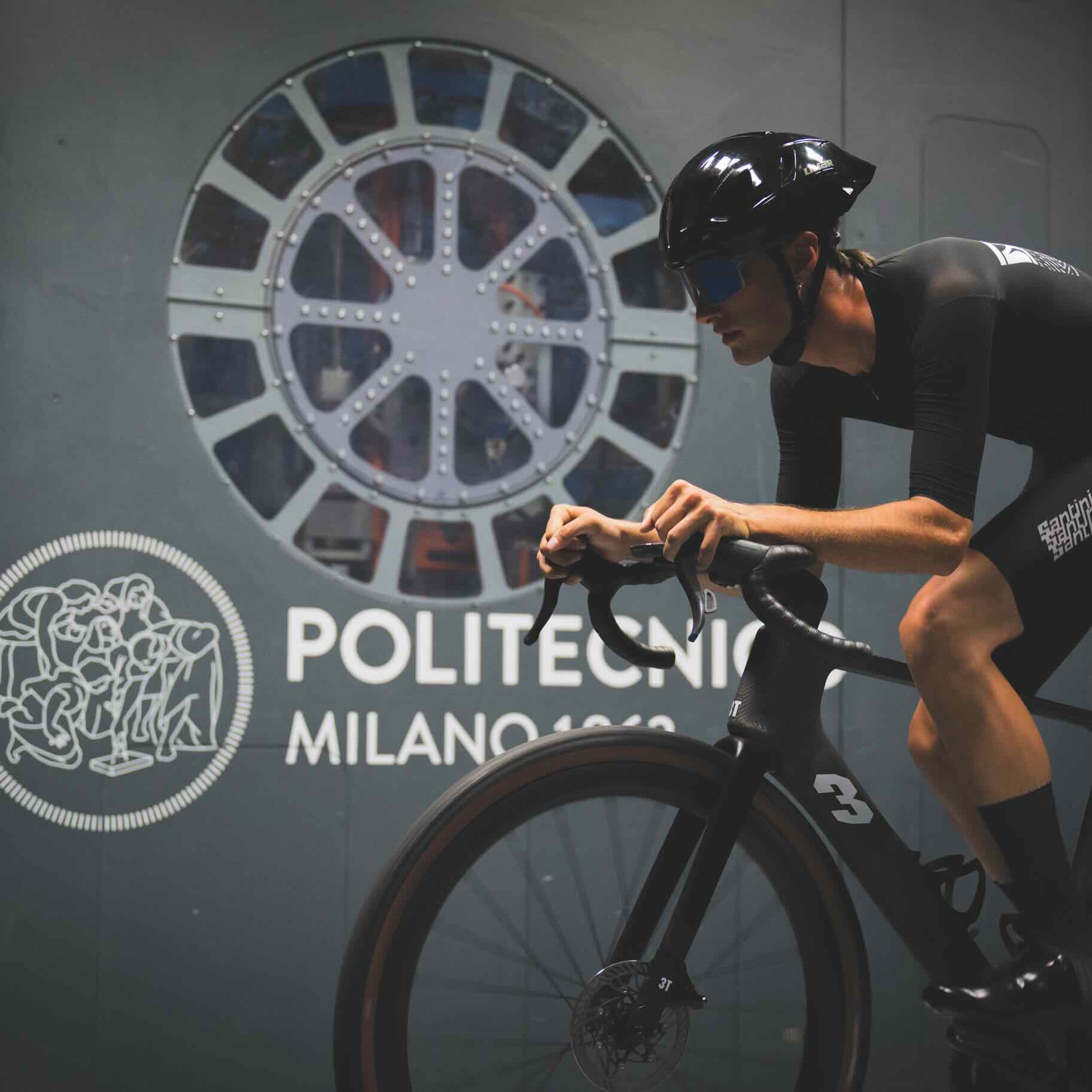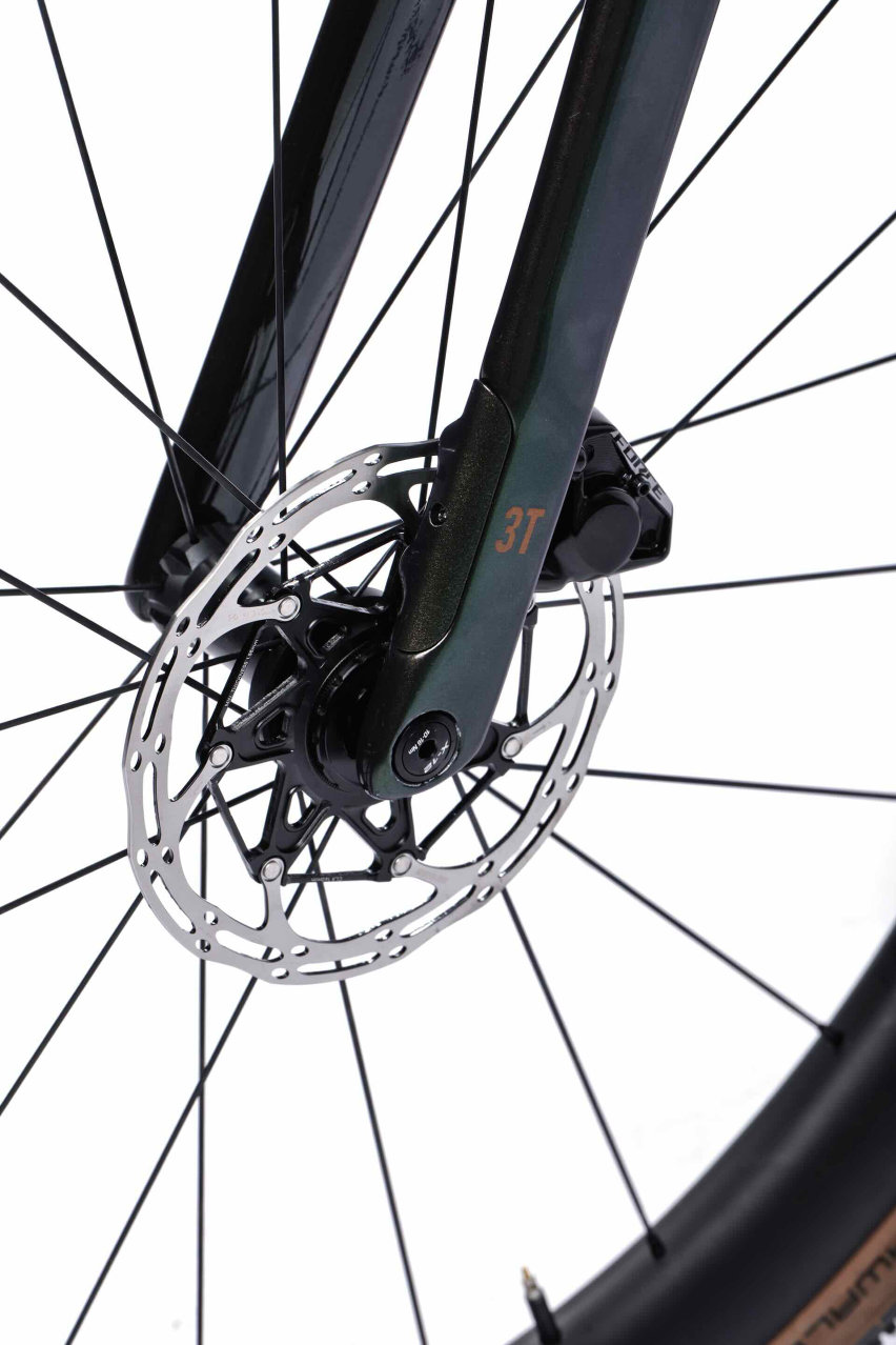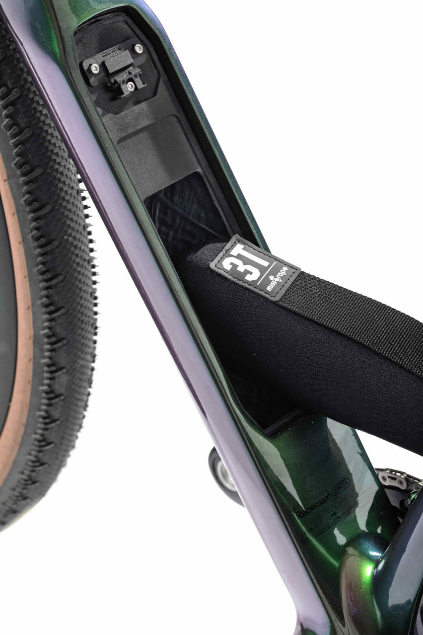 Il downtube eredita la larghezza variabile tipica dei modelli più recenti di 3T: 54 mm nella parte superiore (neck), che presenta anche una sgolatura per accoppiarsi perfettamente con pneumatici da 41 a 51 mm WAM, e 75 mm nella parte inferiore, per deviare l’aria non solo dalle borracce ma anche dagli attrezzi riposti nel vano di stoccaggio integrato.