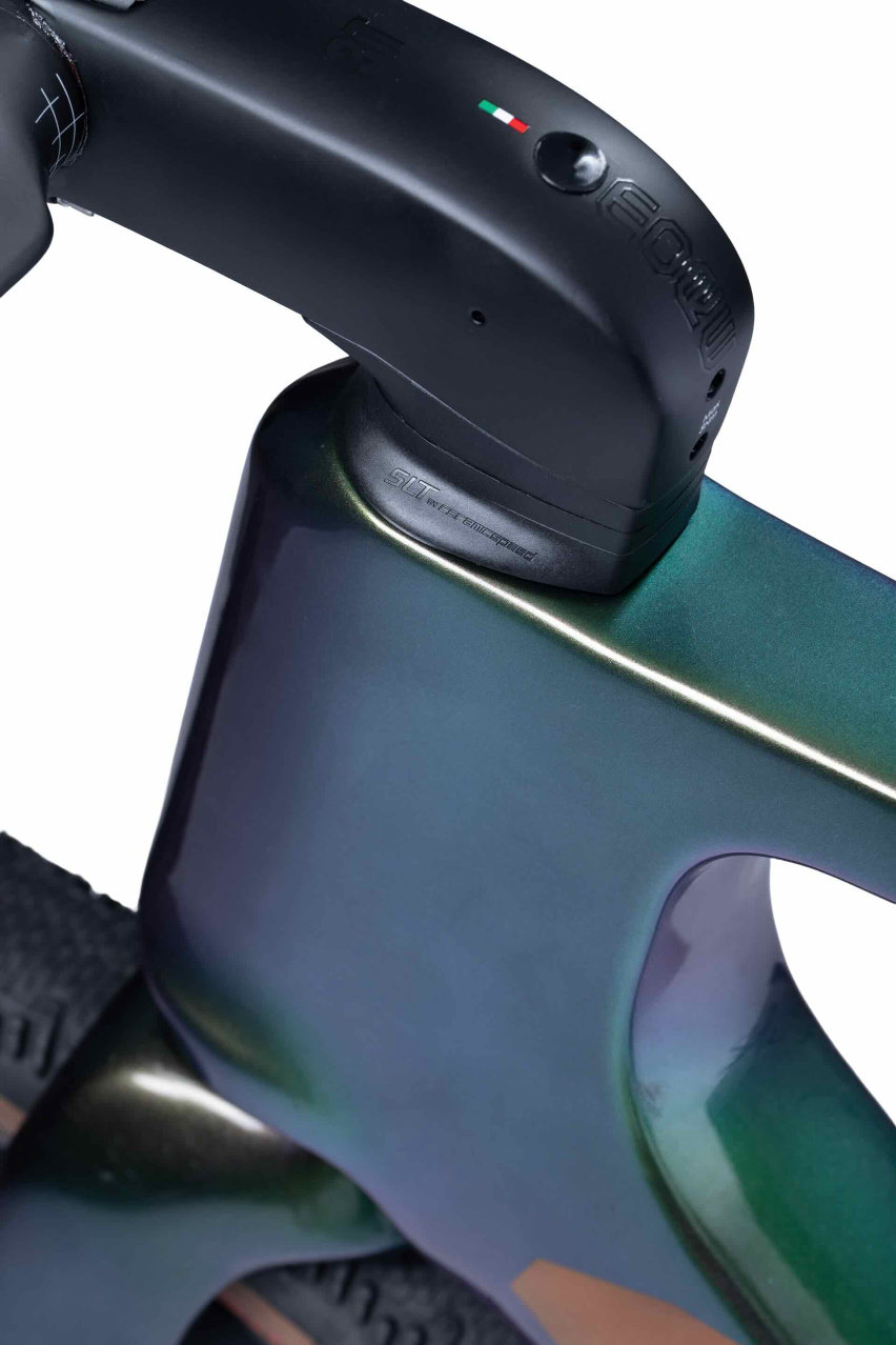 Tuttavia, nonostante l’incremento della superficie frontale, l’aerodinamica della bici non ne risente. Grazie al lavoro di affinamento, le prime simulazioni mostrano un miglioramento dell’efficienza di circa l’1,5 % rispetto alla generazione precedente. Questo risultato deriva soprattutto dal nuovo disegno del tubo sterzo — che integra i cuscinetti CeramicSpeed SLT — ora più stretto e caratterizzato dal “naso” aerodinamico già visto sulla Strada Italia. Inoltre, la forcella è dotata di una picciola copertura che minimizza le turbolenze create dalle le viti a vista della pinza freno.