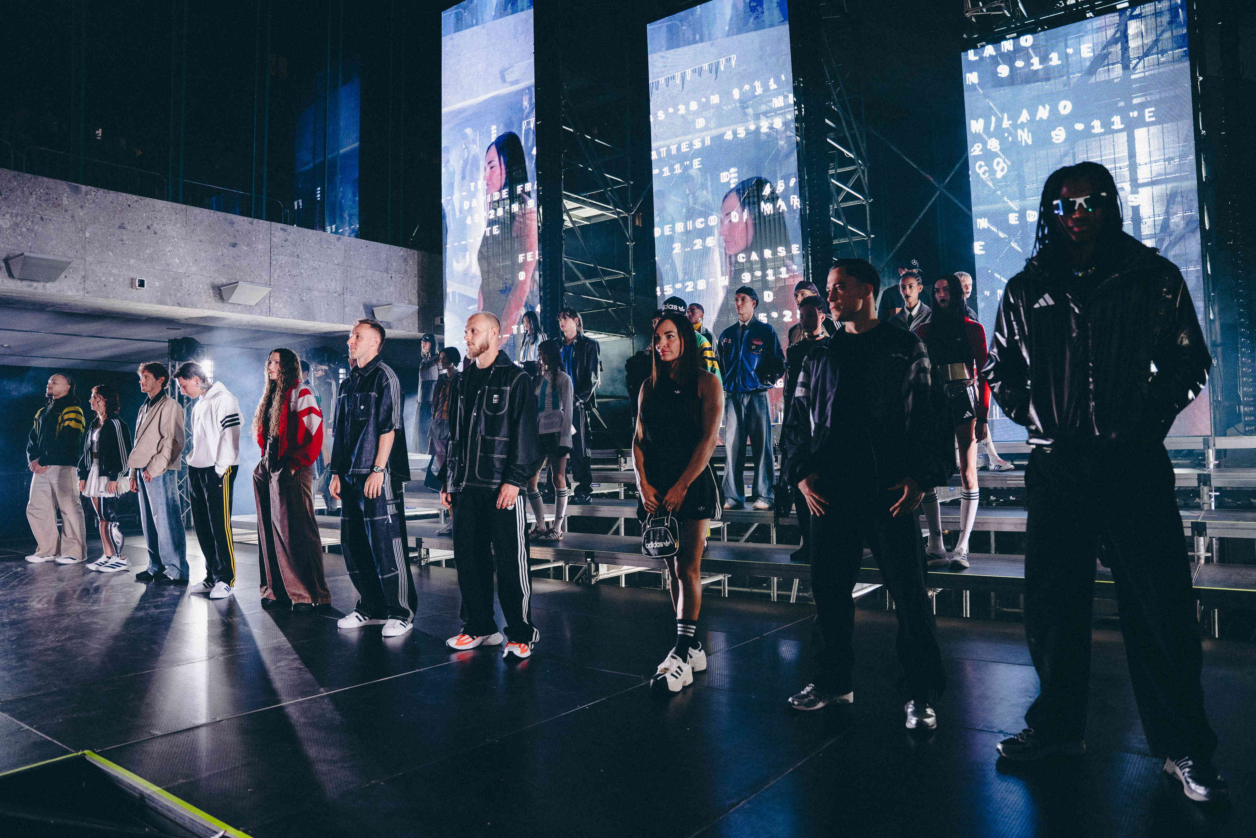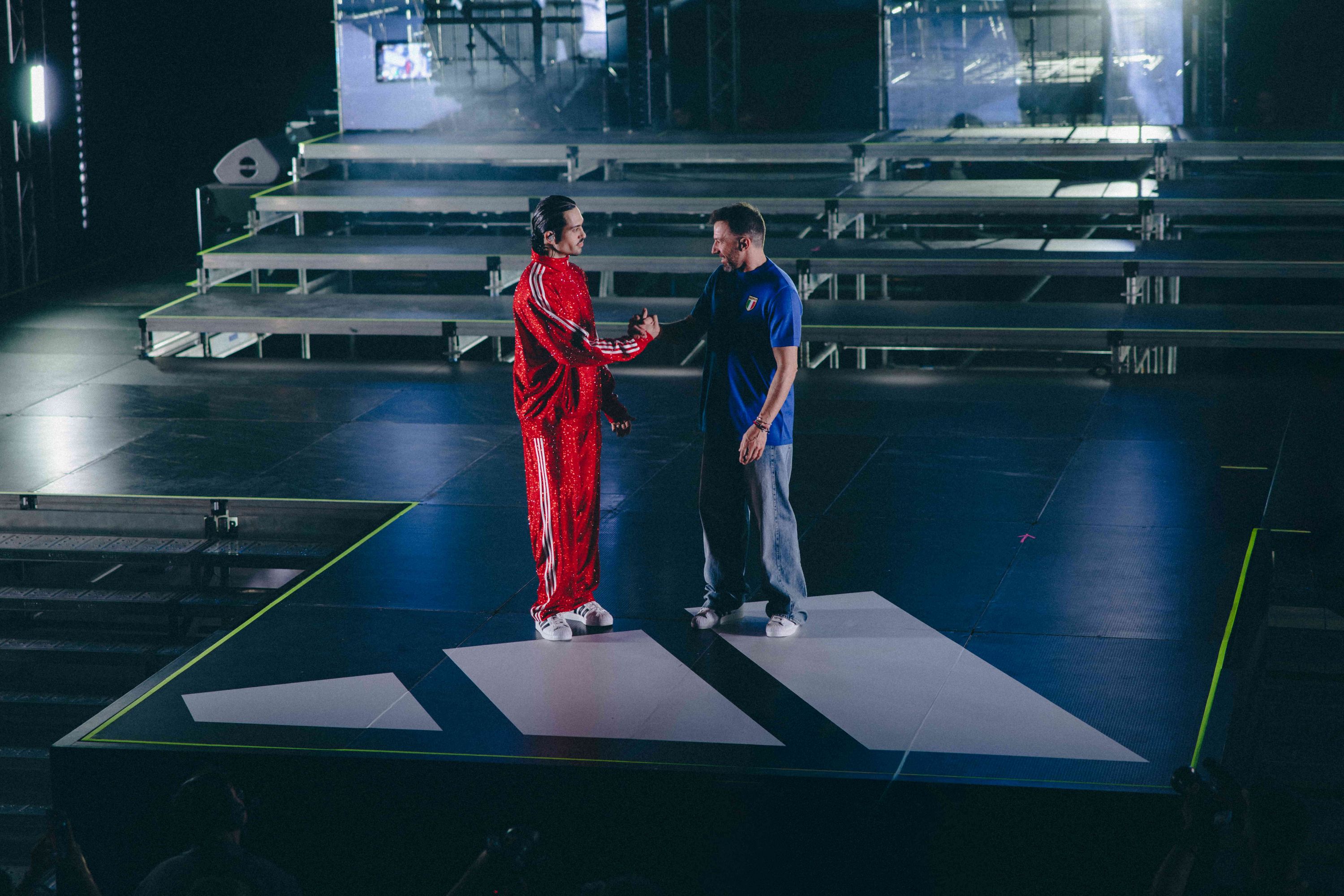 Sul palco prendono forma quaranta outfit che combinano le diverse anime del brand: Originals, Sportswear & Training, Football, Running & Outdoor. Le Three Stripes diventano un terreno di sperimentazione estetica, tra materiali inediti, lavorazioni couture e richiami al calcio, come le Home Jersey della FIFA World Cup 2026™ e i pezzi della capsule ADIDAS WINTER CLUB by Anakin. Tra gli highlight tecnici spicca la giacca Climawarm, dotata della nuova tecnologia di pre‑riscaldamento ad alte prestazioni pensata per le condizioni più estreme. Le sneaker completano la narrazione, dalle iconiche Superstar e Samba alle nuove Hyperboost, ponte tra heritage e innovazione.