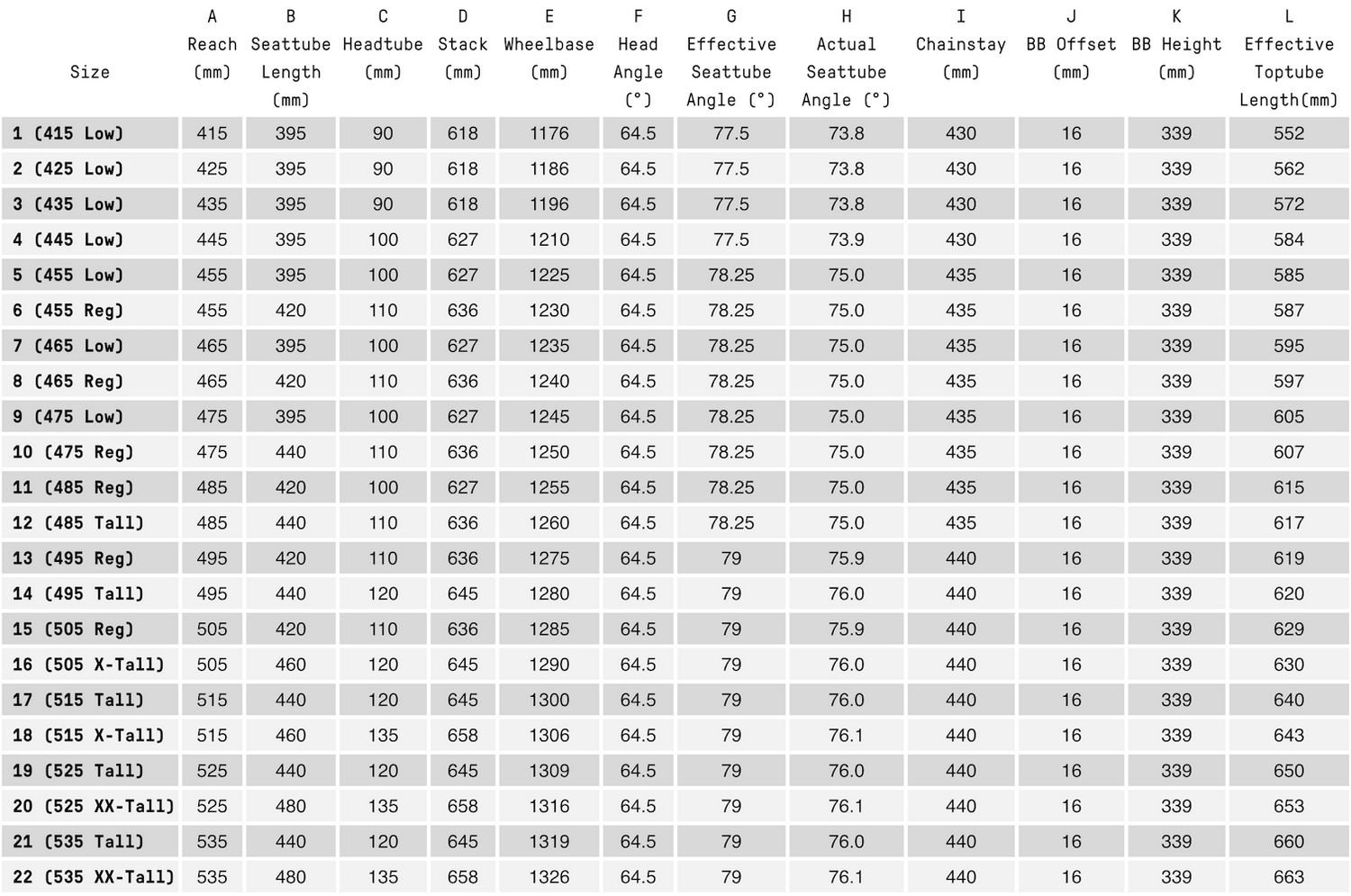 Tra le 22 taglie sono disponibili 13 opzioni di reach che passano da 415 mm a 535 mm con incrementi di 10 mm. Le altre nove taglie sono varianti di quelle etichettate come Low o Reg, oppure Tall o X-Tall. Queste distinzioni si riferiscono all’altezza del piantone sella e del tubo sterzo, offrendo ai ciclisti anche la possibilità di scegliere la misura dello stack.