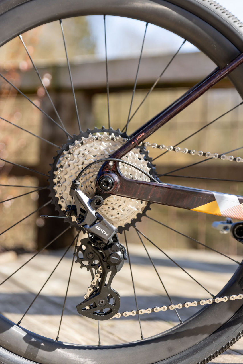 La Grandurance 10 è equipaggiata con gruppo Shimano GRX 1×12 velocità, riferimento nel mondo gravel per affidabilità e gestione della catena su terreni sconnessi. La configurazione monocorona privilegia semplicità e silenziosità di funzionamento, mentre i freni a disco idraulici GRX garantiscono modulabilità e potenza costante anche a pieno carico.