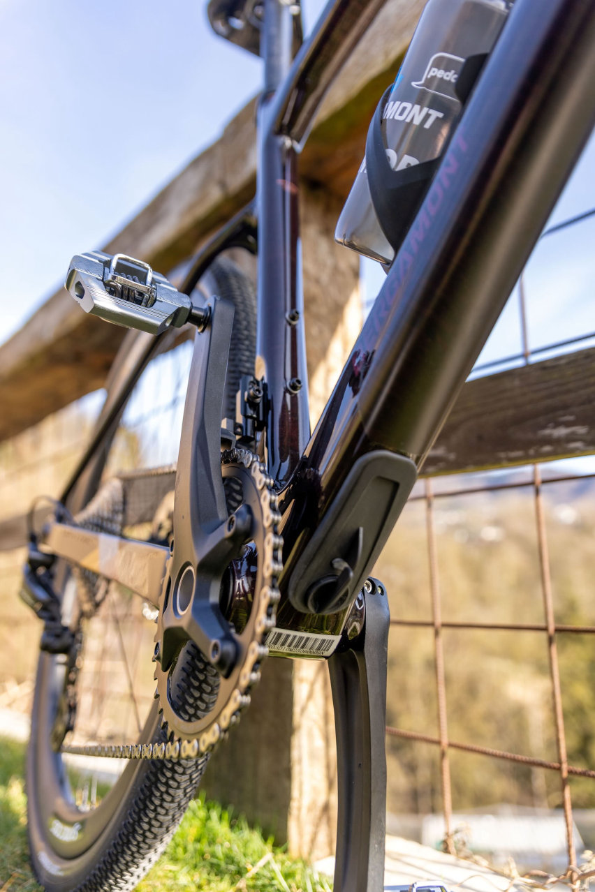 La luce per gli pneumatici arriva fino a 50 mm, ampliando le possibilità di configurazione in base al terreno e allo stile di guida. Di serie monta coperture Schwalbe G-One R da 45 mm, una misura che rappresenta un compromesso efficace tra scorrevolezza e controllo su sterrato compatto.
