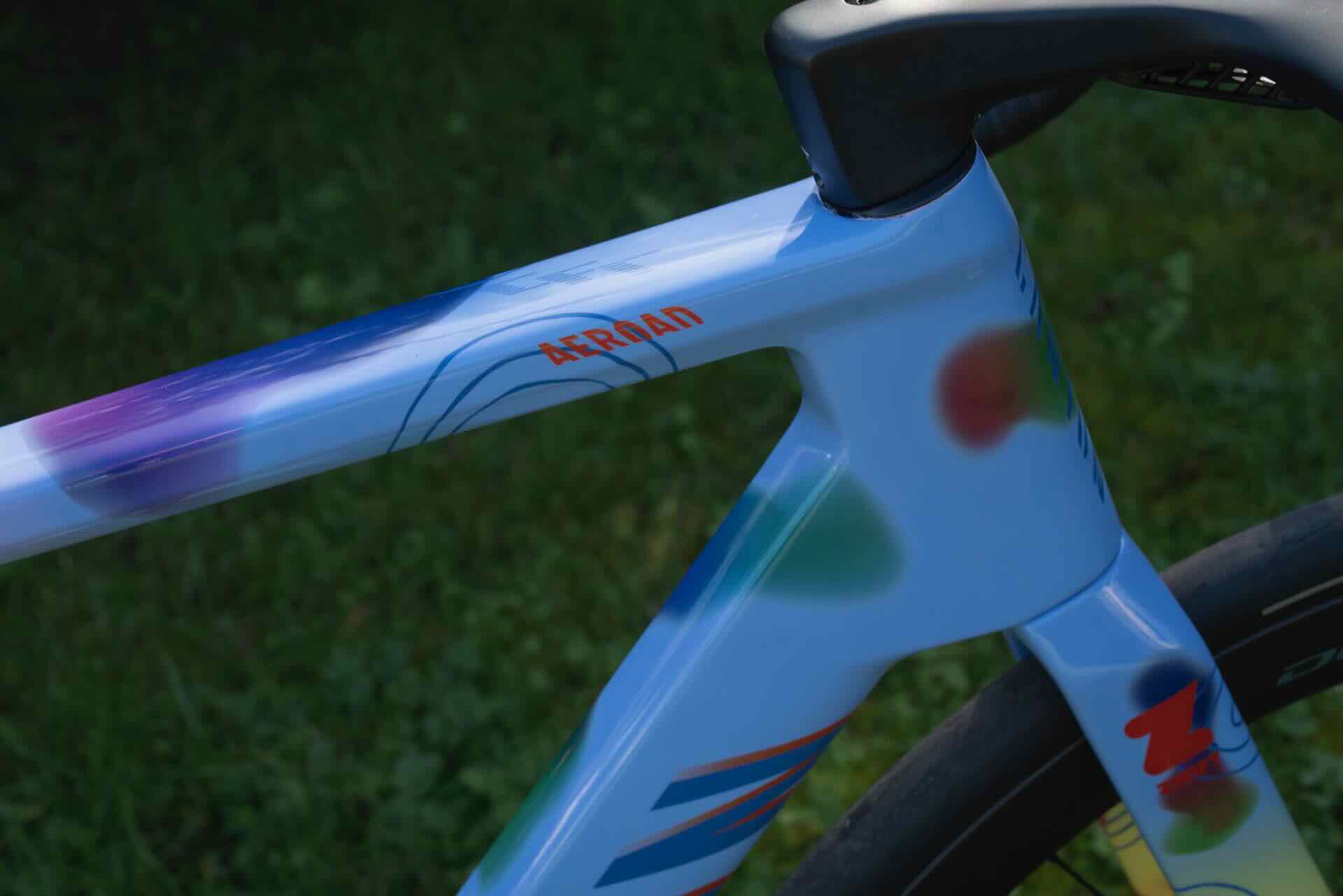 Ispirandosi ai temi del colore e dell’energia, il design di Salmistraro incorpora impronte digitali dai colori vivaci e audaci, in una tavolozza cromatica caleidoscopica. Il risultato è una “combinazione perfetta di modernità e divertimento, ideale per attirare l’attenzione“, che potrebbe essere il motivo per cui van der Poel ha scelto questa bici per la Tirreno-Adriatico di questa settimana.