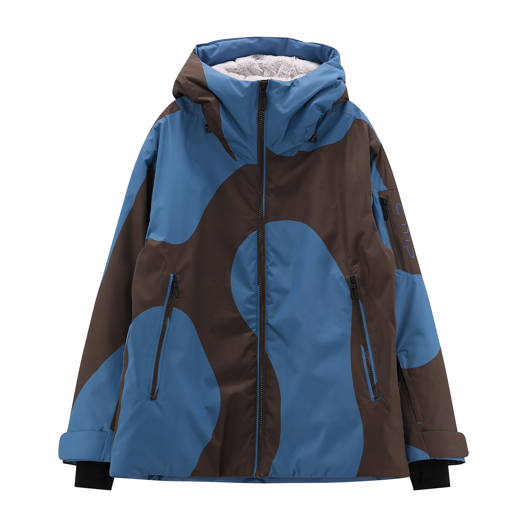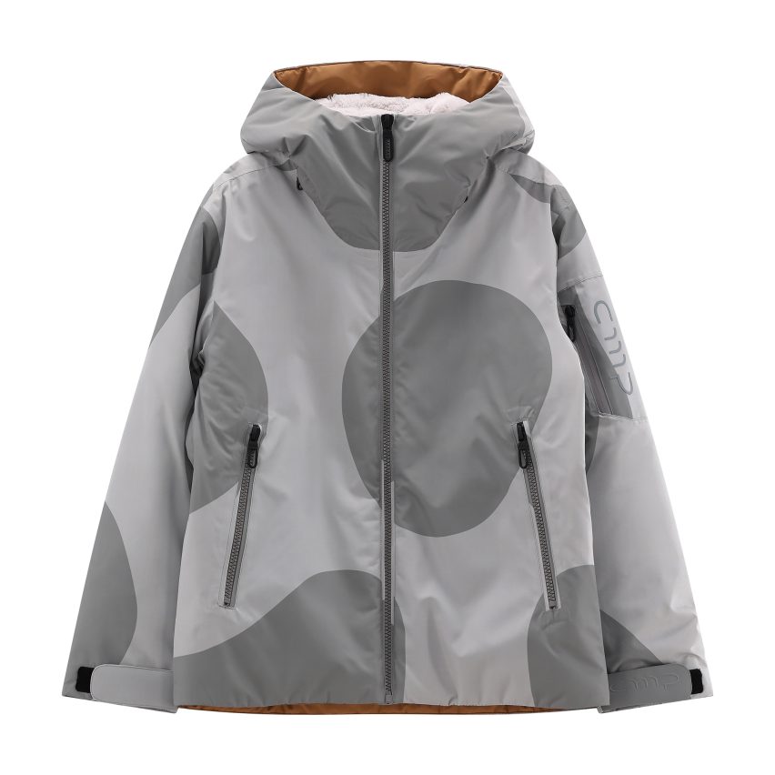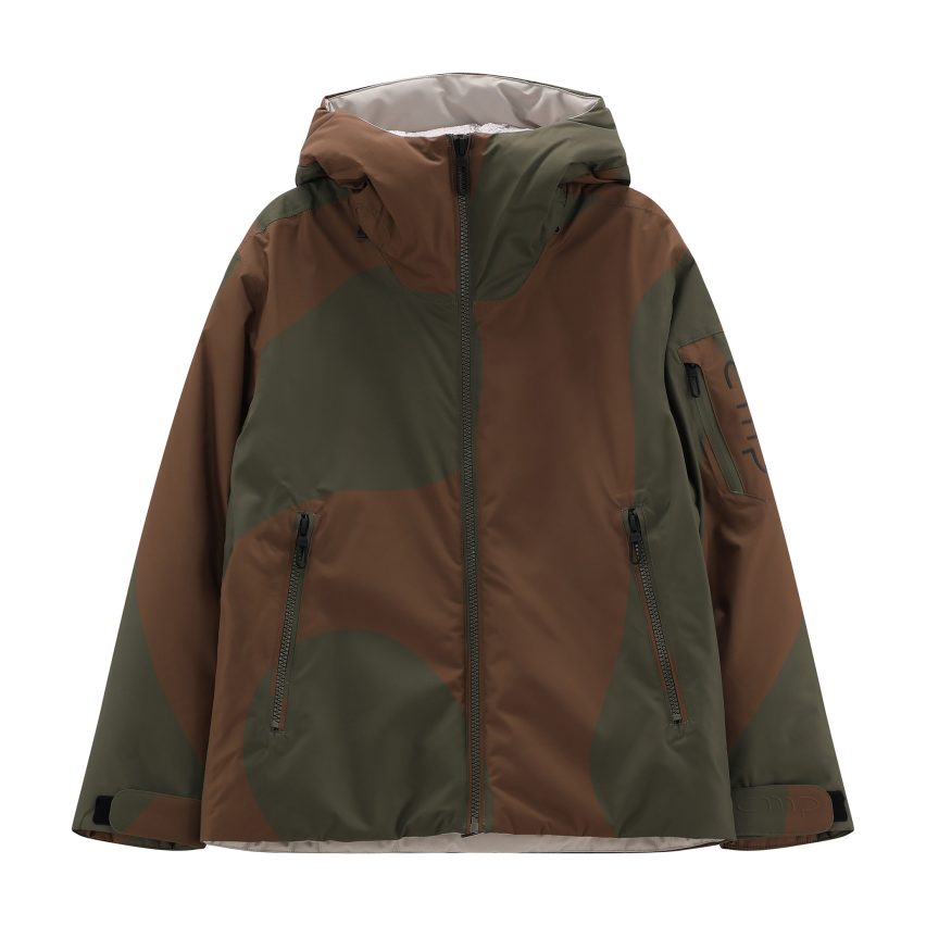 Una giacca tecnica che diventa lifestyle grazie alla stampa allover fluida e avvolgente.