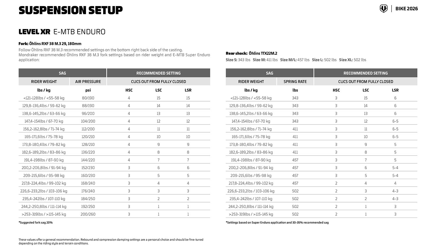 I produttori di solito raccomandano una rigidità della molla in base al peso del biker. Si tratta di valori approssimativi, ma forniscono un buon punto di partenza.