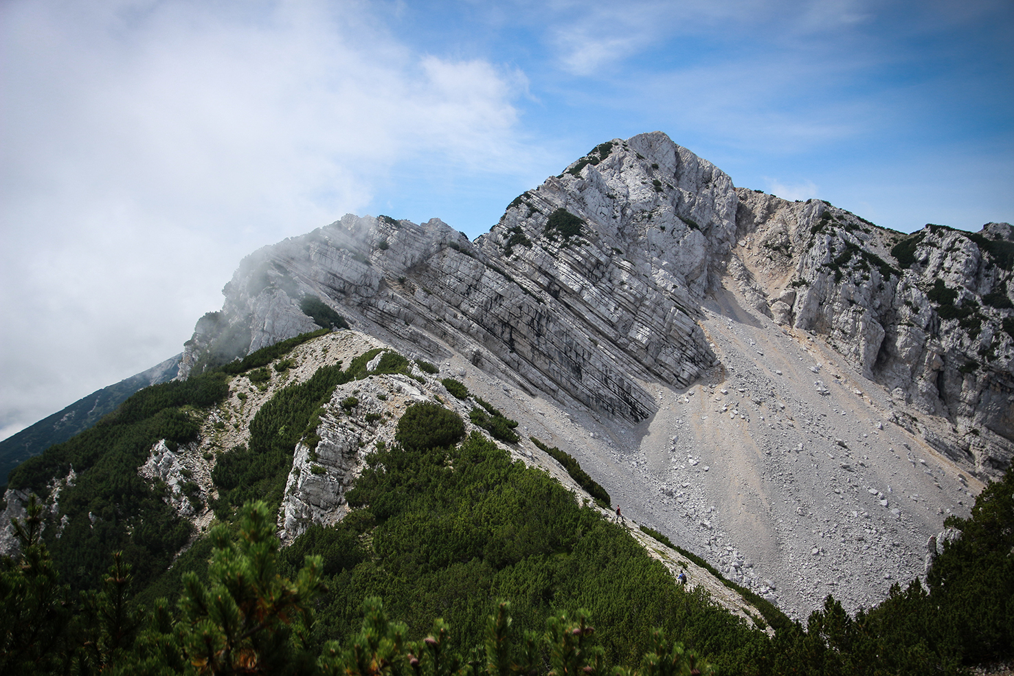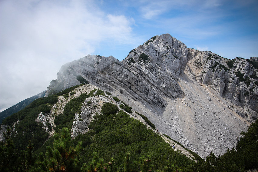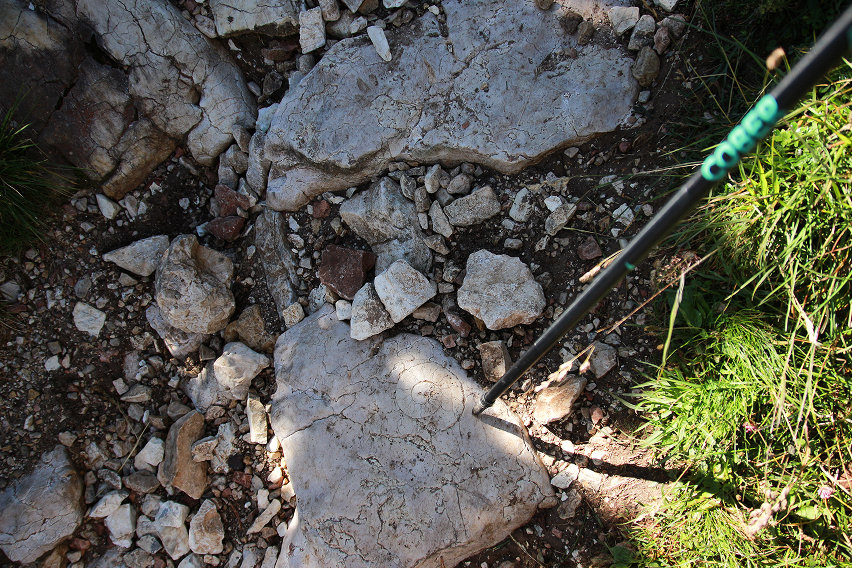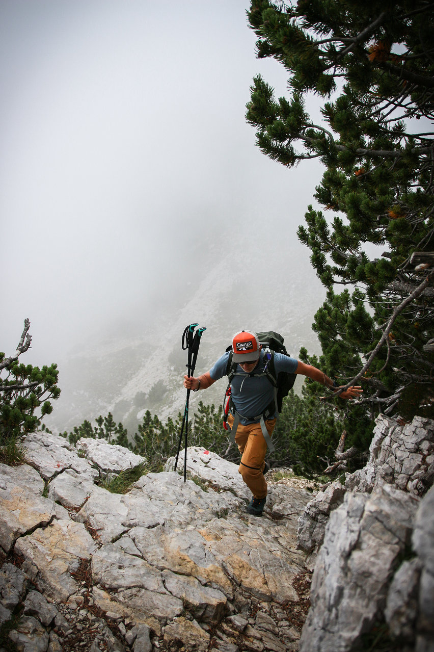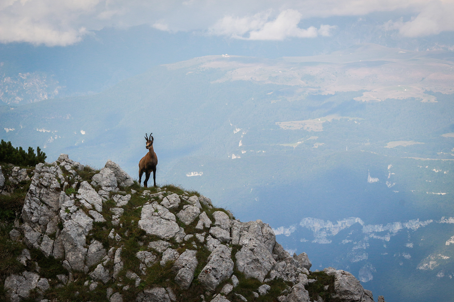 Facciamo un’altra sosta poco oltre quest’ultimo, a 1.950 m. Le nuvole qui toccano la montagna e a tratti intravediamo il panorama che verso sud si estende fino a Peschiera del Garda. “Silenzio!” intima Daniele, e voltandoci scorgiamo fra la nebbia un gruppo di camosci brucare nell’erba: saranno solo i primi di numerosissimi branchi che incontreremo in questi giorni, compagni di viaggio discreti ma socievoli che Roger guarderà con grande curiosità. Passata Cima Costabella, il sentiero perde quota e il terreno inizia a farsi roccioso. Cominciamo a sentire la fatica, gli zaini sono pesanti e a tratti ci aspettiamo e incoraggiamo a vicenda.