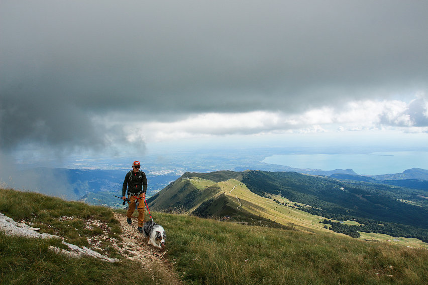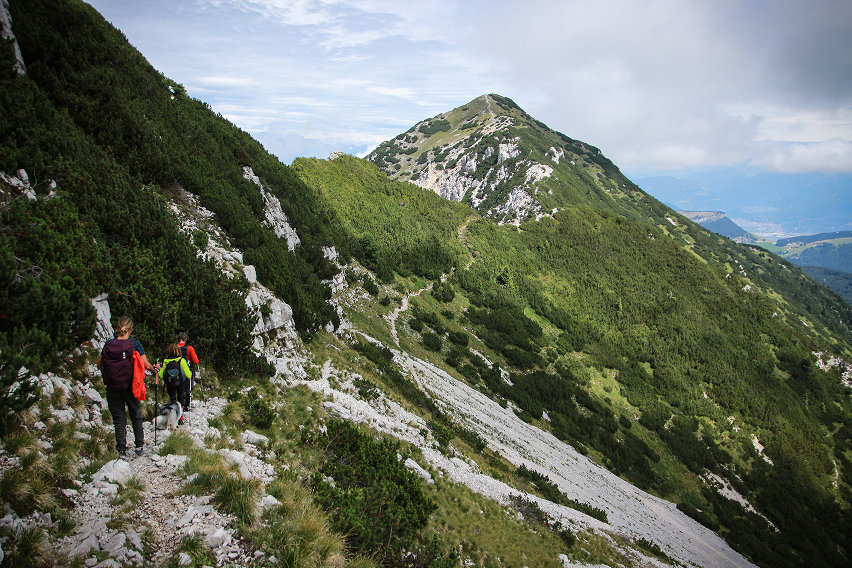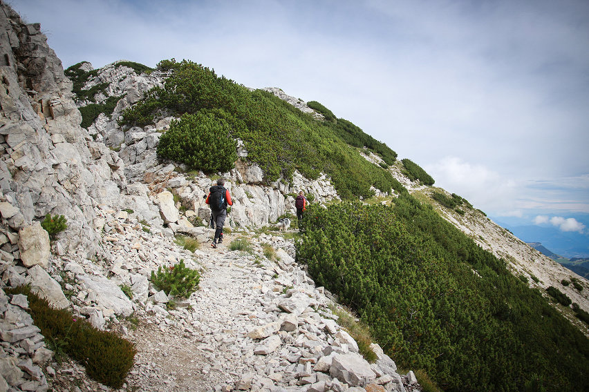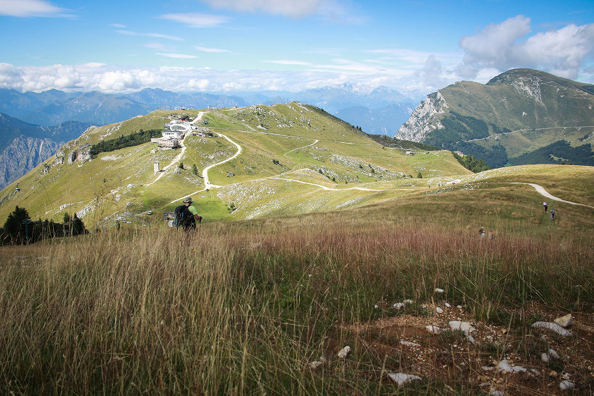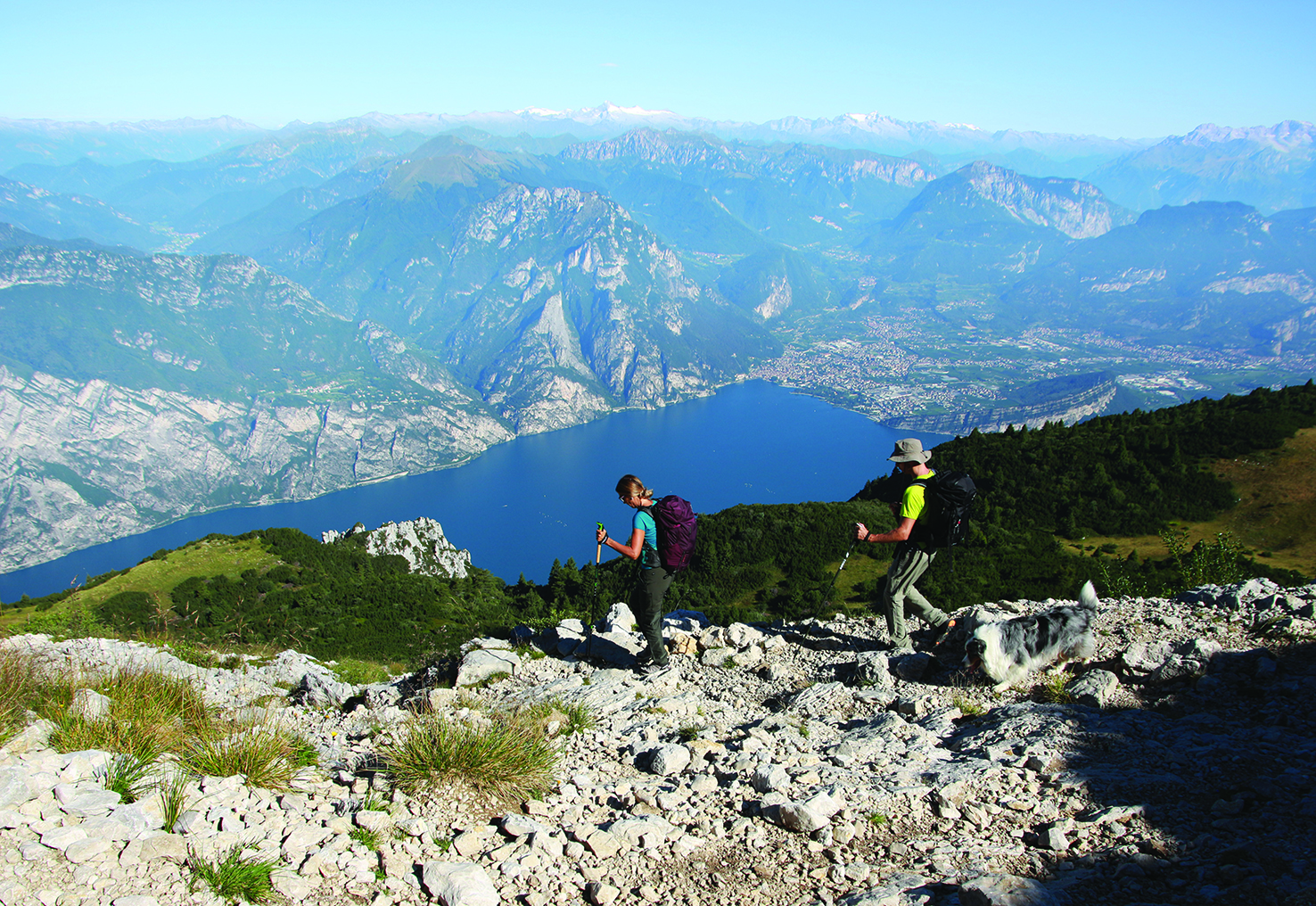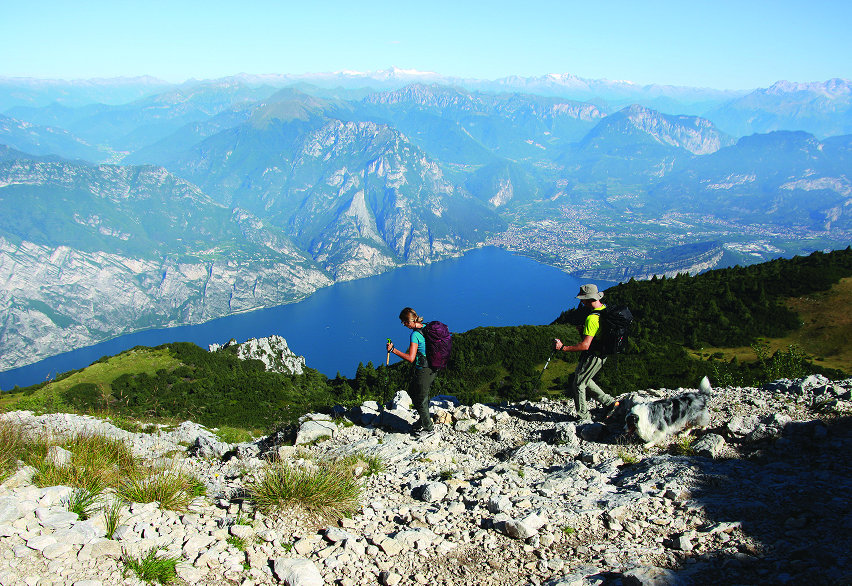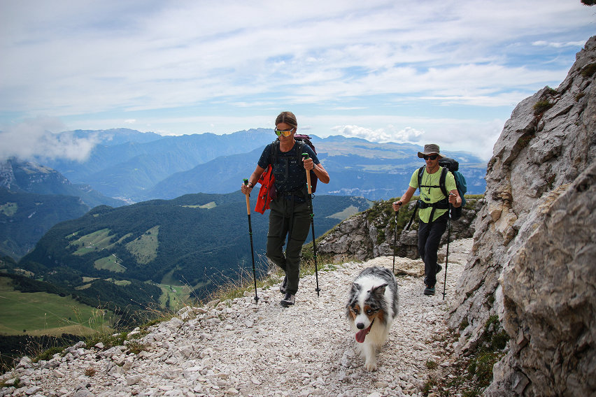 È un saliscendi continuo su un sentiero stretto che si dipana fra pini mughi e fiori colorati. Qualche passaggio richiede attenzione e capita di dover tenere stretto Roger nei punti più esposti. I nostri sguardi si perdono fra scorci spettacolari verso l’azzurro del Garda, l’improvviso avvistamento di un camoscio a pochi passi, il profumo della macchia e il bellissimo altopiano che dal primo giorno affianca il Baldo sul lato est.