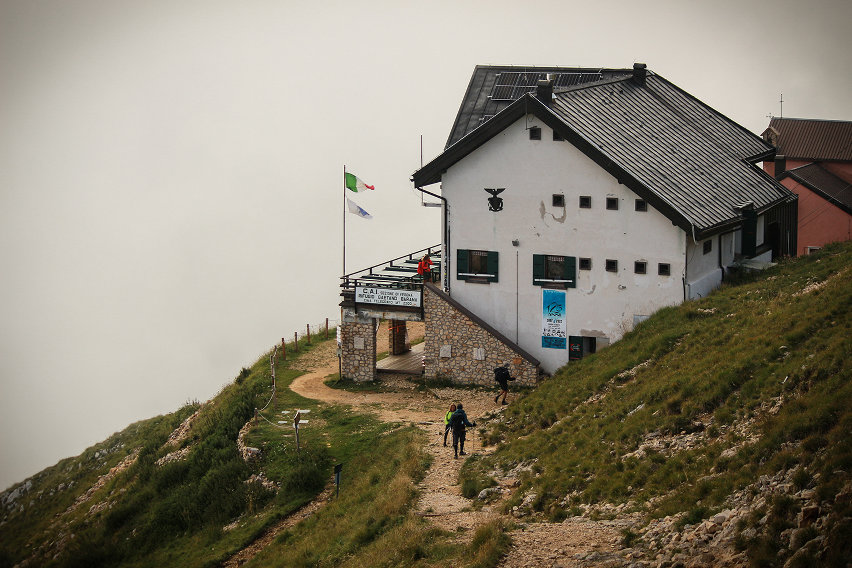 Alla quota di 1.680 a cui ci troviamo fa freddino e mentre cerchiamo riparo dietro qualche roccia brindiamo con una bottiglia di Dolomiti Rosso che Daniele si era caricato sulle spalle. Una volta ripartiti, il sentiero scavalla nuovamente sul versante ovest della cresta e inizia a seguirne il filo offrendo un bellissimo panorama sul lago. A circa un’ora di distanza raggiungeremo il Rifugio Fiori del Baldo e, 200 m sopra di esso, il Rifugio Chierego.