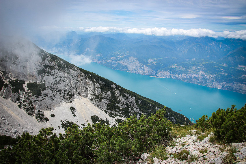Qui a Cima delle Pozzette, a 2.132 m, troviamo una decina di persone che mangiano e prendono il sole: sono arrivati tutti da nord, dall’arrivo della funivia di Malcesine che scorgiamo più in basso e a qualche chilometro di distanza. La vista qui è spettacolare, in un colpo d’occhio spazia da Desenzano e Torbole, di fronte a noi, 2.000 m più in basso, Campione del Garda. Verso le 14.00 iniziamo a scendere, con l’obiettivo di raggiungere la zona di arrivo della funivia.