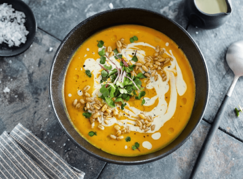 - Cena: zuppa di carote e zenzero con chicchi di grano KAMUT®.