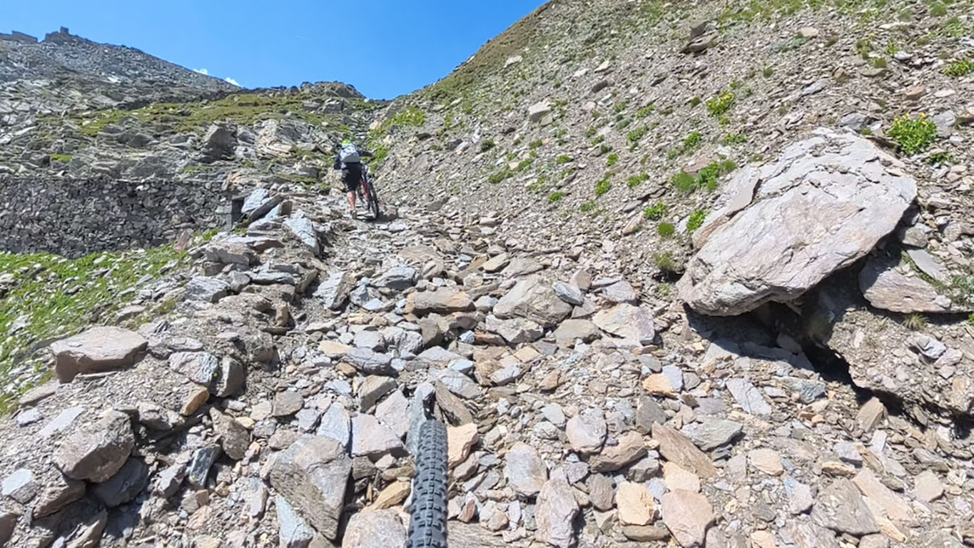 La prima parte è scorrevole, ma man mano che si sale la strada diventa impegnativa: grandi sassi rendono impossibile pedalare anche con e-bike performanti. Qualche tratto a spinta e poi di nuovo in sella.