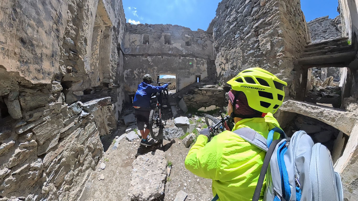 Il vento è gelido, le raffiche fortissime quasi ci sbalzano di sella. Decidiamo di scendere di quota, ma non vogliamo ripercorrere la stessa strada. La fortuna ci fa incontrare un gruppo di biker torinesi che ci raccontano di un sentiero molto esposto, un mix di freeride e passaggi tecnici che porta direttamente al lago del Moncenisio passando per il Forte Pattacreuse.
