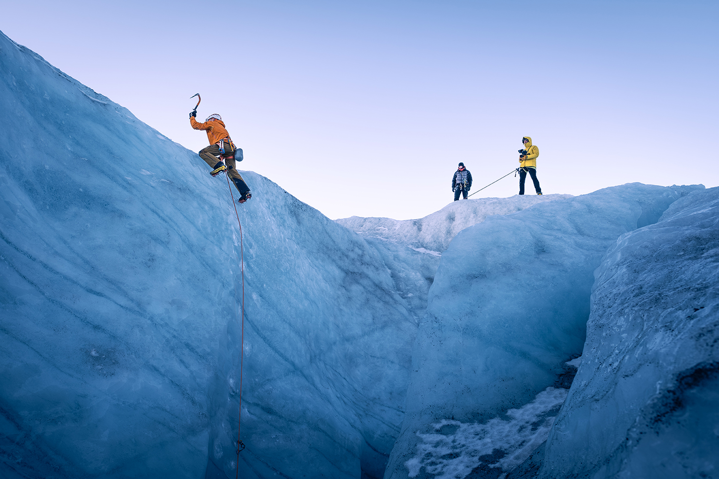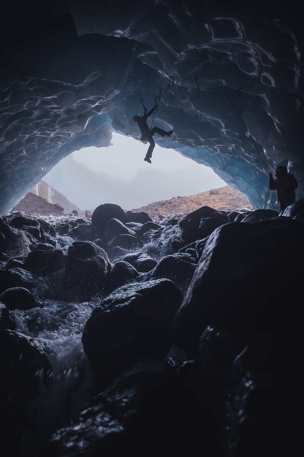 La prima cosa a cui guardo è la sicurezza. Era quindi necessario che i luoghi scelti non presentassero alcun rischio, né per l’arrampicatore né per l’assicuratore che rimane sul fondo del mulino per tutta la salita. Il secondo punto riguarda l’estetica e le possibilità offerte dal mulino. I colori e le forme create dalla natura sono per me un elemento decisionale molto importante. In Islanda il colore del ghiaccio va dal bianco o blu fino al nero. Apprezzo particolarmente il ghiaccio nero, il cui colore deriva dalle polveri di lava.