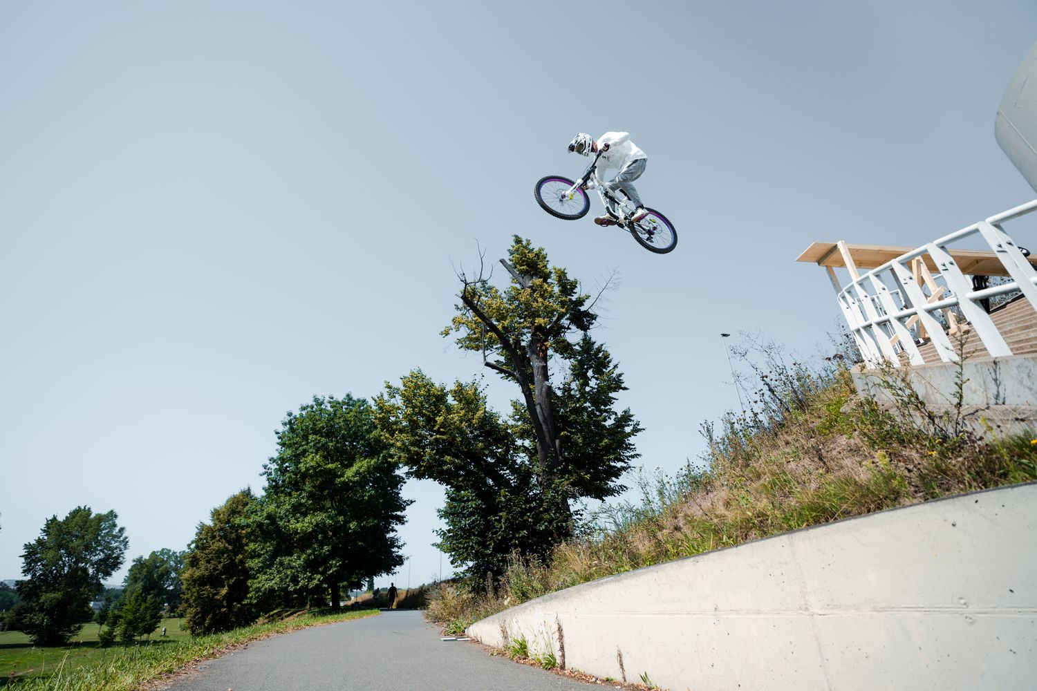 Un altro momento saliente del video è il passaggio sopra l’arco del ponte Troja, alto 34 metri. Nel momento in cui Gabriel ha visto lo spot, ha capito: “Devo provarci”. Sebbene pedalare in salita fosse più difficile del previsto, aveva ancora abbastanza energie per impennare spontaneamente: “Il wheelie non era previsto, inizialmente volevo solo attraversarlo, ma una volta arrivato in cima ho pensato: ‘perché no?’”