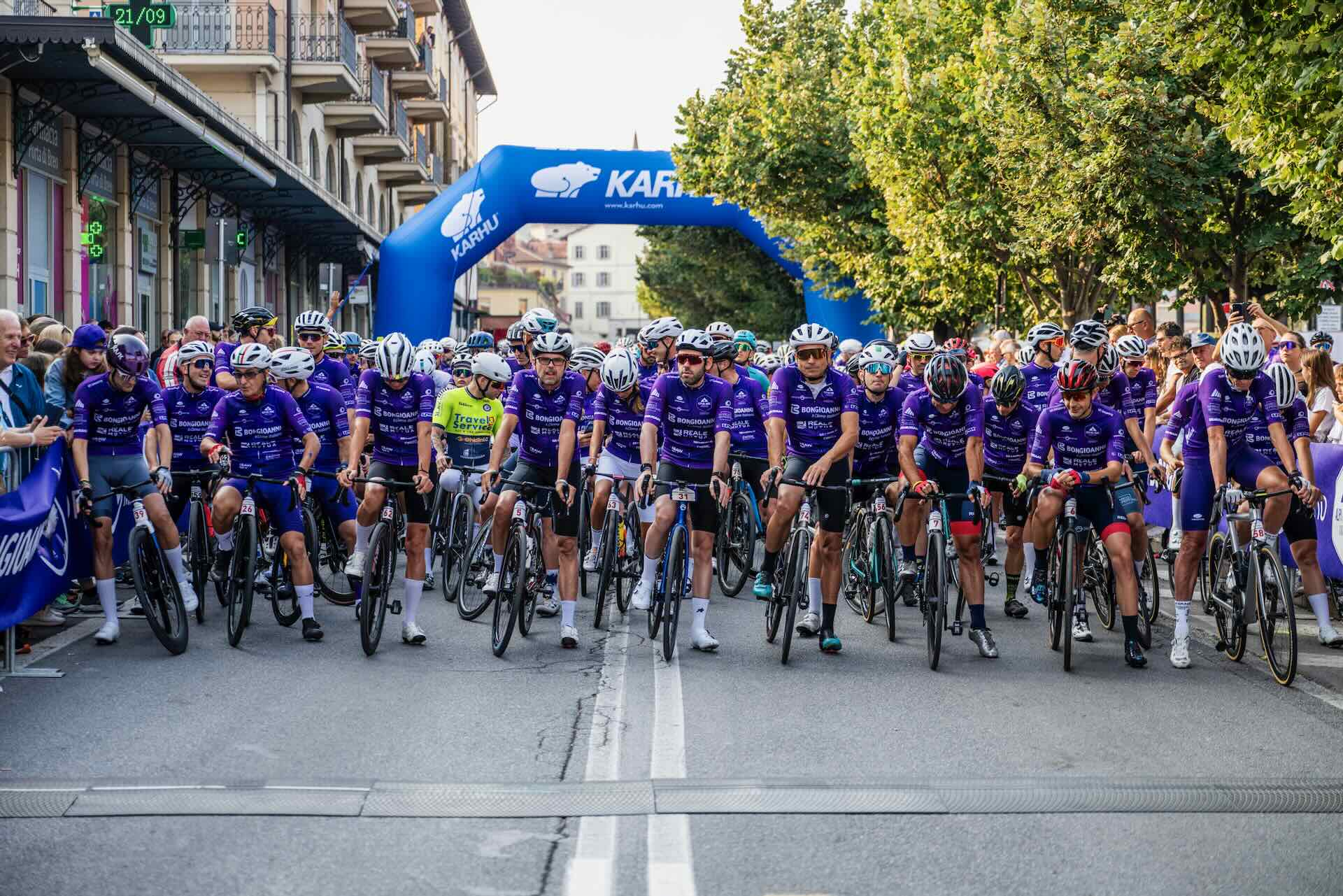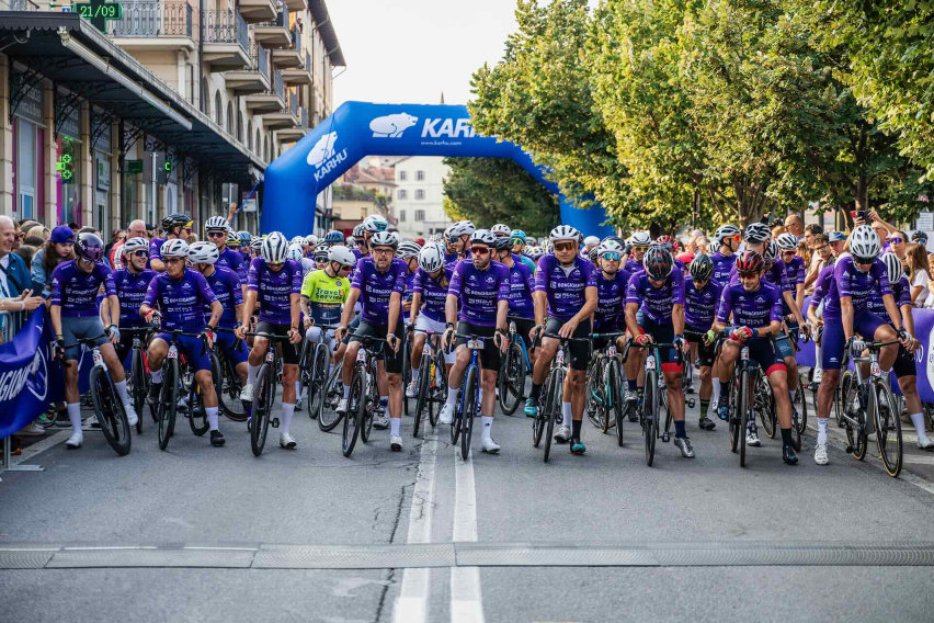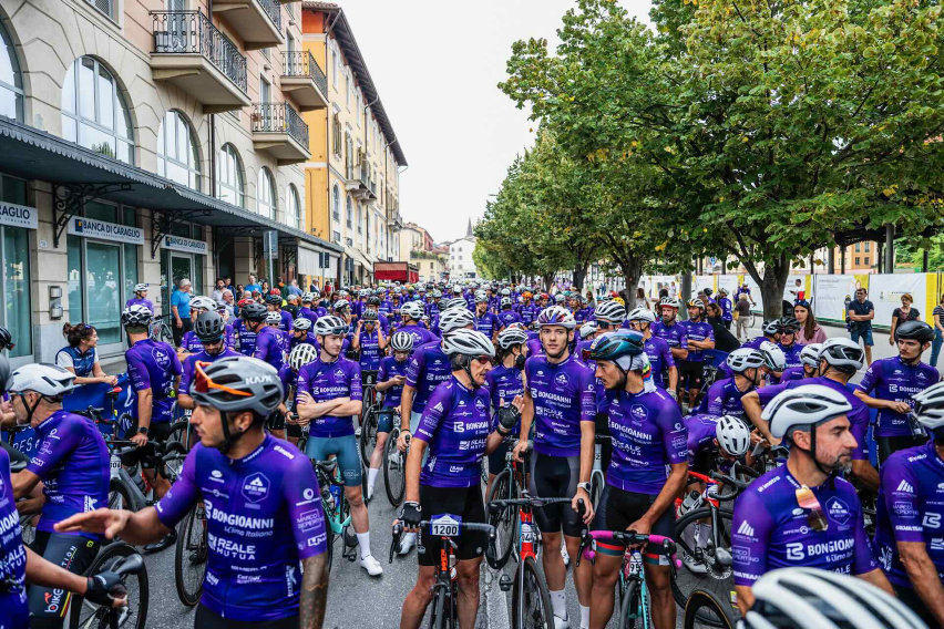 Sulla linea di partenza fa impressione l’impatto delle oltre 2.000 maglie create ad hoc per l’evento, con altrettanti ciclisti pronti a vivere una giornata all’insegna del divertimento. Si, perché il clima è quello di una festa dello sport, l’agonismo si percepisce appena, smorzato dalle battute dello speaker. Benedizione del parroco, mai così vicina al ciclismo in quanto anch’egli ciclista, con citazione della mamma “mi raccomando… vai piano” e si parte.