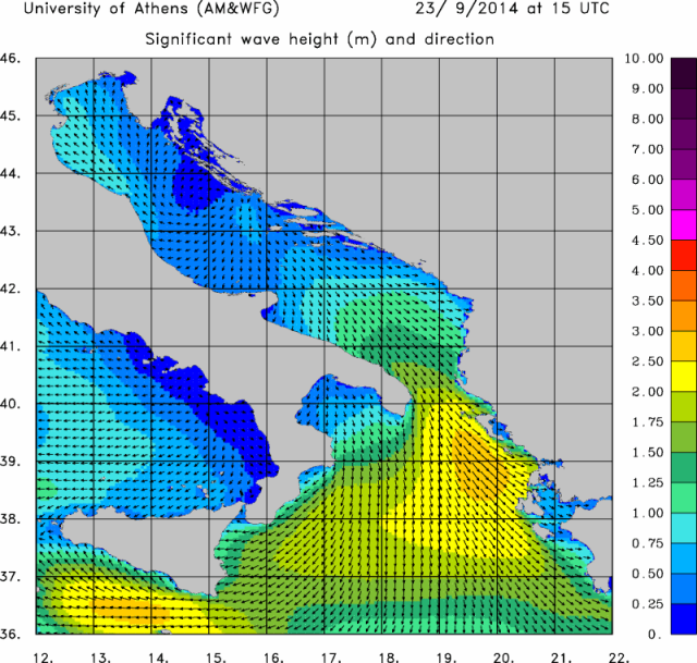 Lo swell Ionico nel momento di massimo caricamento, martedì 23 ore 17. Modello: WAM – Università di Atene