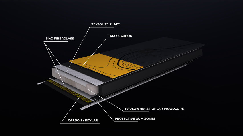 - Il 4R rocker riprende lo stesso principio applicato alla punta, dove quattro diversi raggi di curvatura creano un profilo che riduce la resistenza, aumenta il galleggiamento e migliora la precisione direzionale.