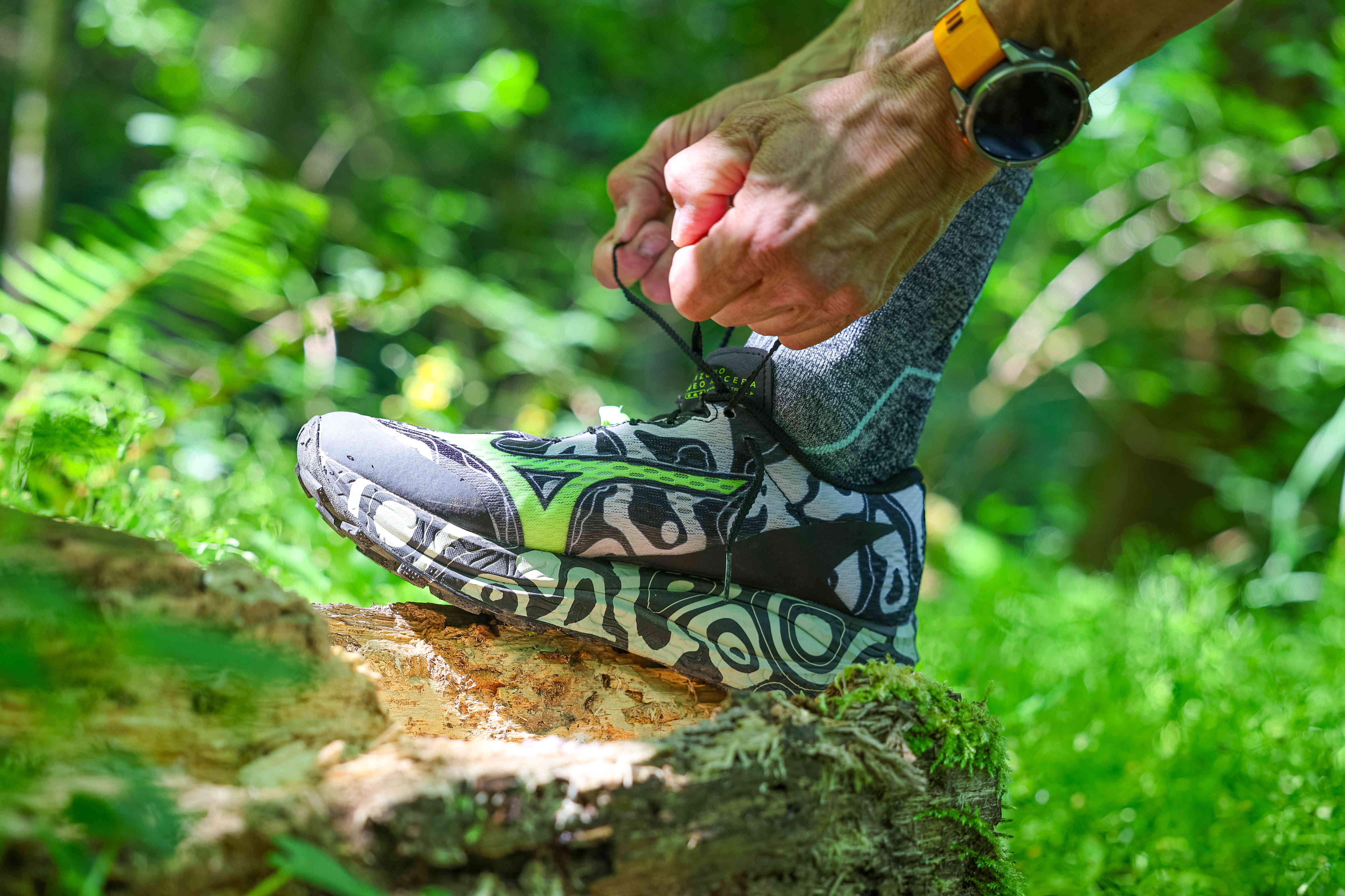 La calzata è uno dei primi elementi che sorprendono. La sensazione iniziale è quasi “troppo comoda per essere una trail”, ma la chiusura progressiva dei lacci zigrinati — davvero eccellenti — e la linguetta minimale, ma stabile, danno molta sicurezza e avvolgono bene il piede. Una volta allacciata, la scarpa non richiede aggiustamenti: resta ferma, prevedibile, e…i lacci non si slacciano mai!
