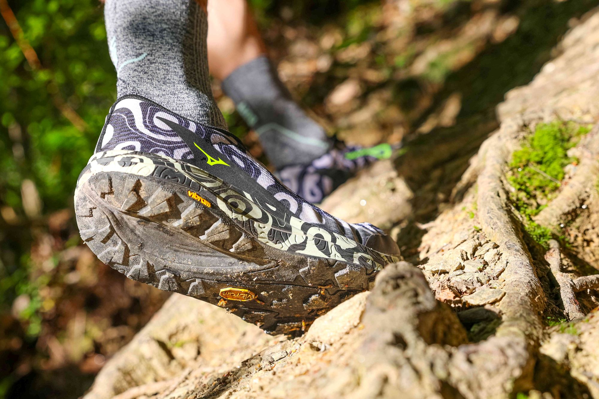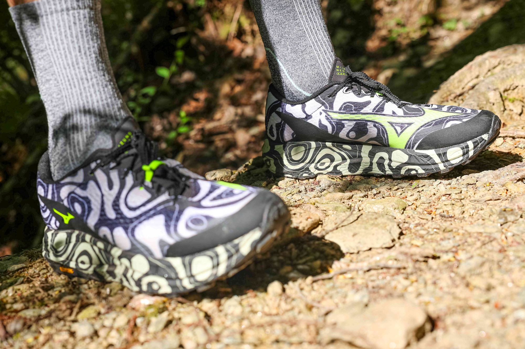 La colorazione della versione testata è una dichiarazione d’intenti: diversa, fuori dagli schemi Mizuno strada, quasi a voler dire “qui si cambia registro”. Le linee sono pulite, i materiali scelti con criterio, la costruzione comunica solidità senza diventare pesante. L’intersuola alta colpisce subito, soprattutto per una scarpa pensata per l’off‑road. La tomaia ha un aspetto tecnico ma non rigido, con una trama che bilancia contenimento e comfort. Le finiture sono curate, le cuciture ridotte al minimo: tutto sembra progettato per durare.