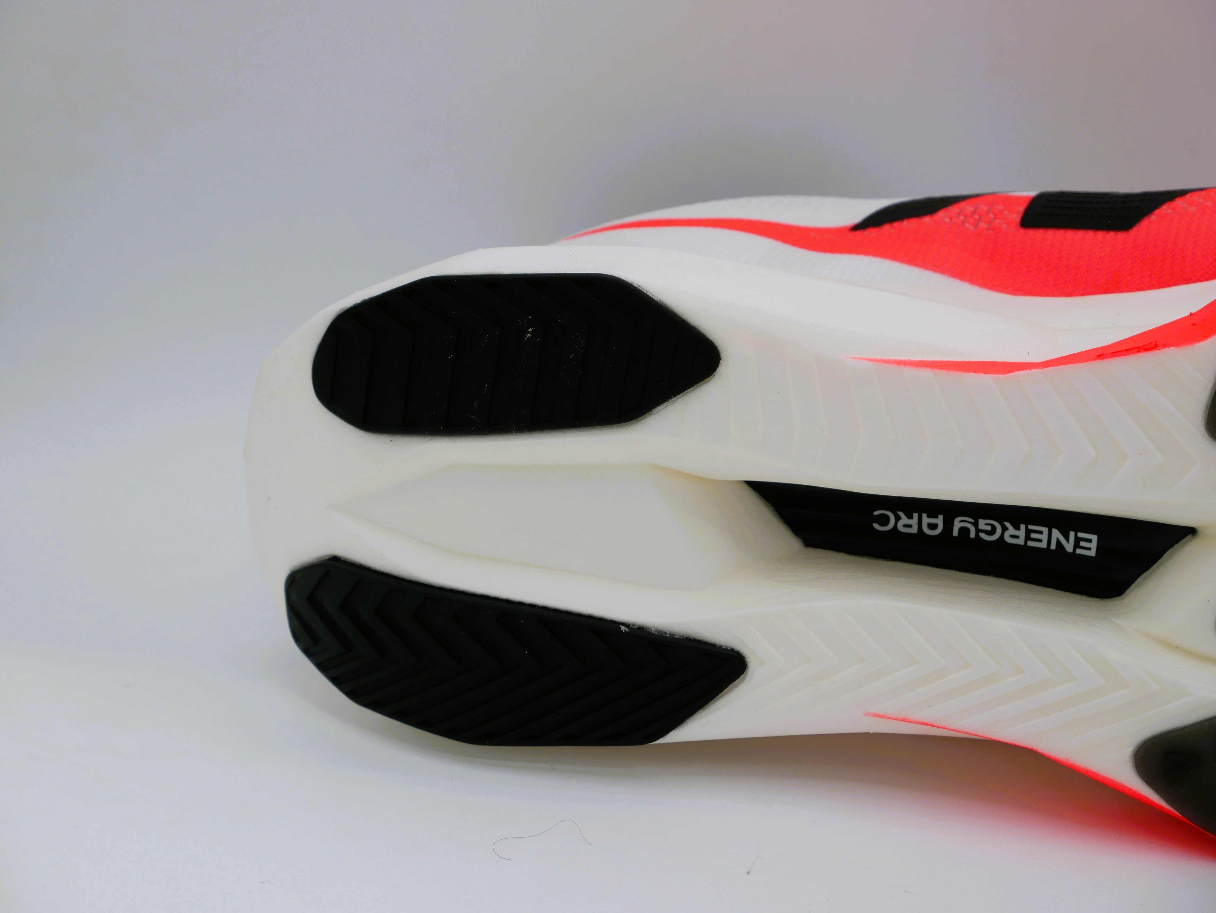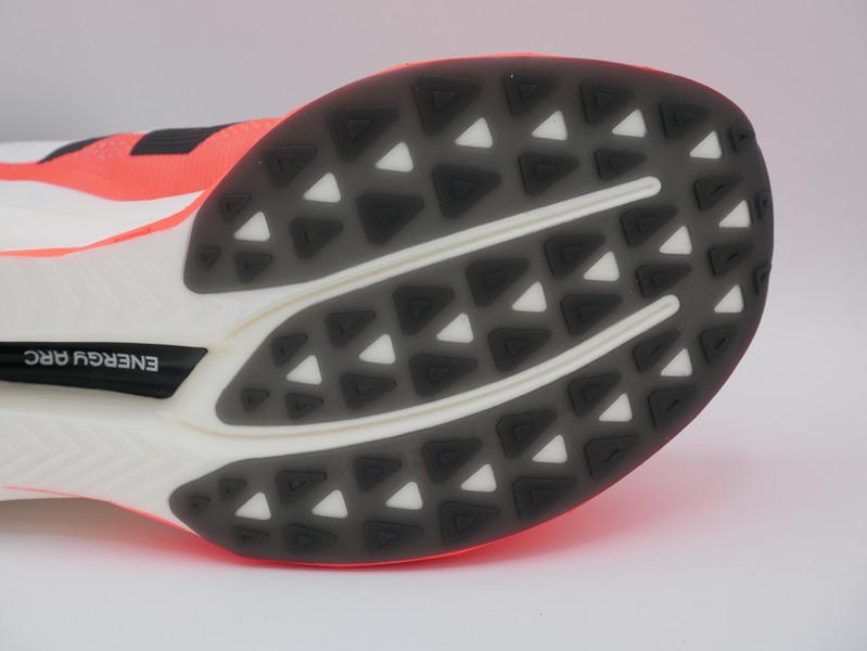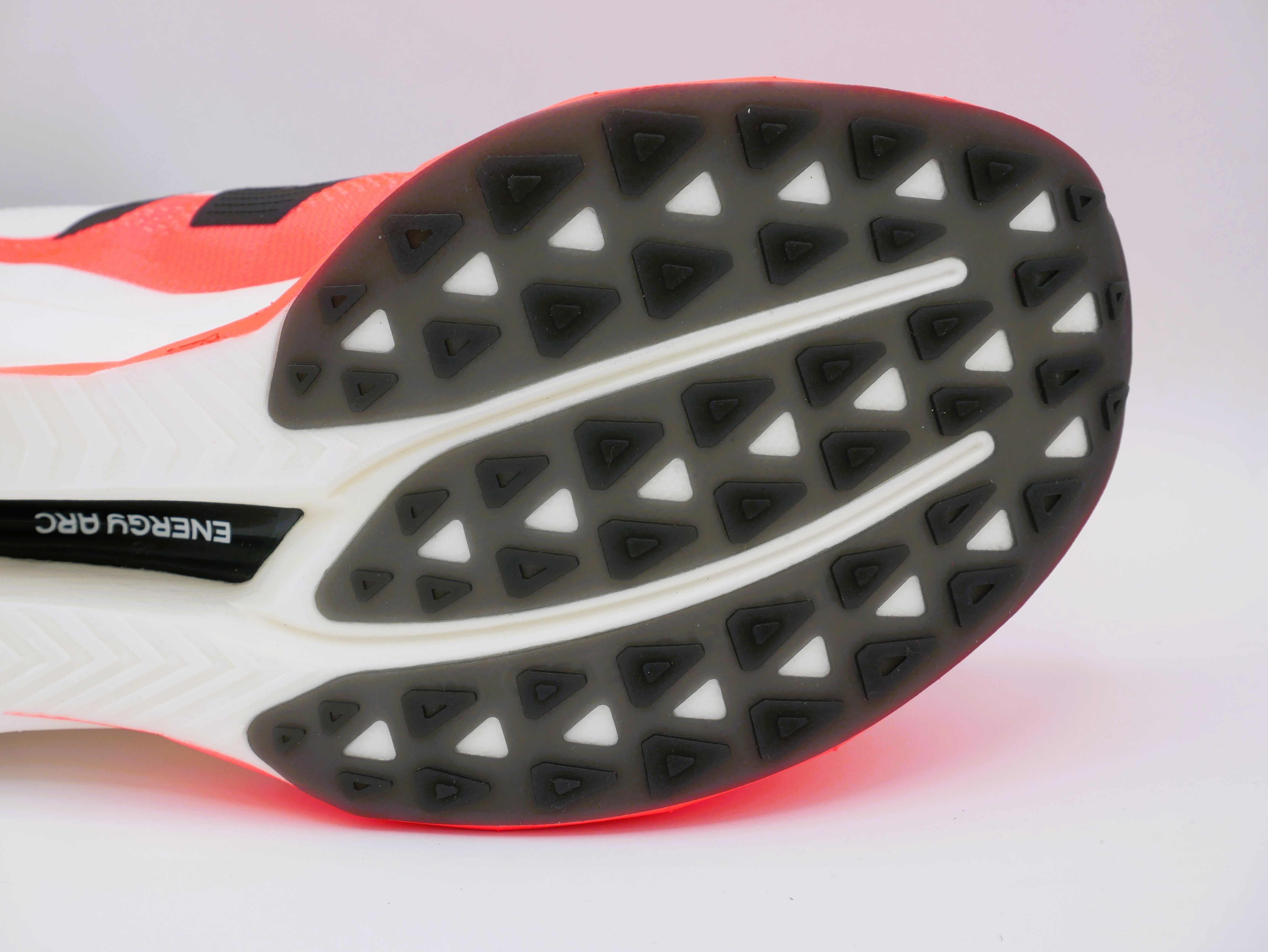 La suola è pensata per l’asfalto, con una mescola che garantisce aderenza anche su superfici umide. Per tagliare corto, una scarpa che permette di correre forte anche nei wet day… I tasselli triangolari sono distribuiti in modo strategico per offrire grip nei punti di maggiore impatto, senza appesantire la scarpa, con un’ottima superficie d’appoggio in tutta la zona dell’avampiede.