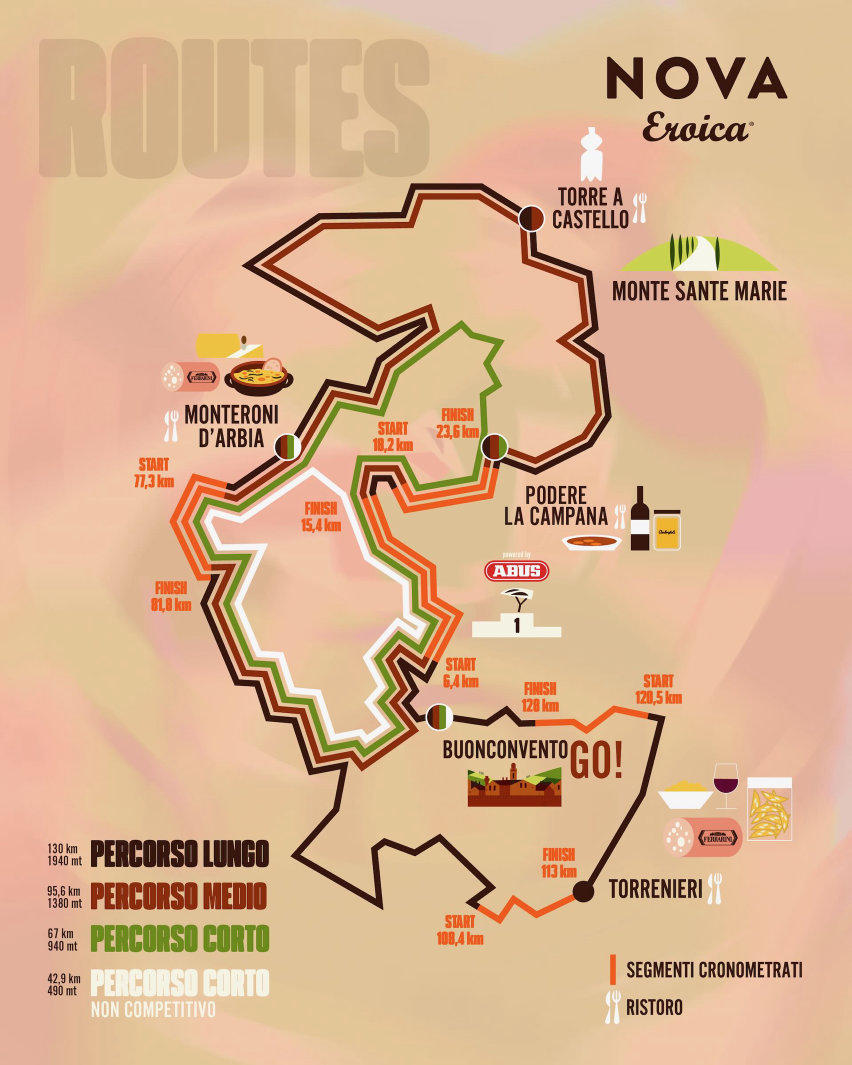 I percorsi di NOVA Eroica attraversano 17 comuni, seguendo le tracce permanenti de L’Eroica e di Eroica Montalcino. Un lavoro che, negli anni, ha contribuito a trasformare questa parte di Toscana in una delle destinazioni più apprezzate dal cicloturismo internazionale.