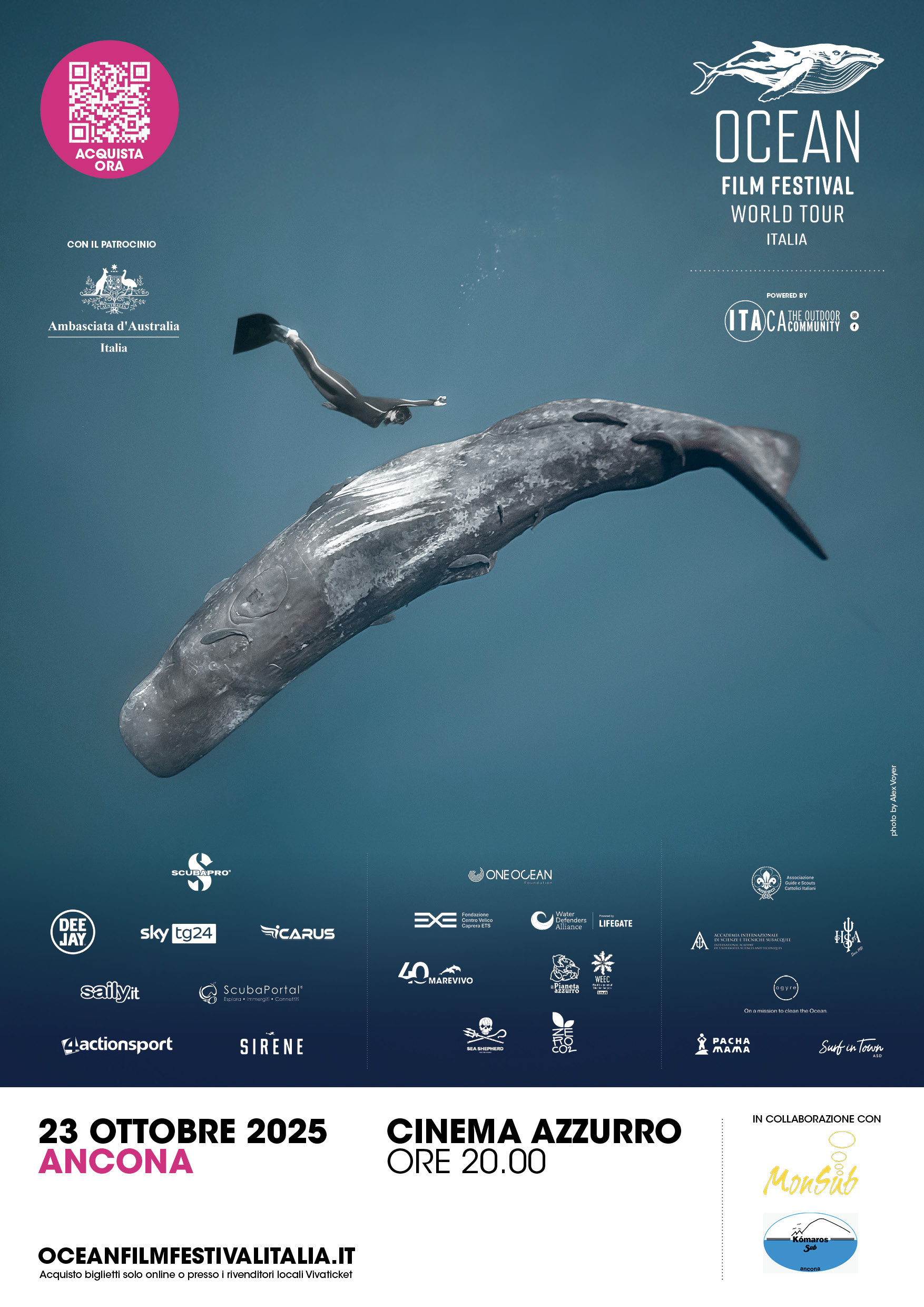 OCEAN FILM FESTIVAL WORLD TOUR torna in Italia per la nona edizione, pronto a incantare il pubblico con una selezione dei migliori film internazionali dedicati al mondo del mare. Dal 14 ottobre al 17 novembre 2025, il tour attraverserà 20 città, abbracciando quasi tutta la penisola: dalla Lombardia alla Puglia, dal Friuli alla Sardegna. Tra le nuove tappe di quest’anno spiccano Pescara, Ancona e Como che si aggiungono a una mappa sempre più ampia di spettatori e appassionati. NON PERDERTI LA TAPPA DI DOMANI AD ANCONA.