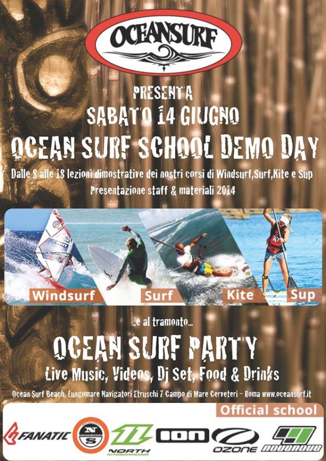Sabato 14 giugno presso lo stabilimento Ocean Surf Beach di Campo di Mare ( Cerveteri -Roma) si terrà il primo Ocean Surf School Demo Day: un’intera giornata dedicata alla prova libera e alle dimostrazioni di tutte le discipline promosse dallo storico centro surf: sup, sup fitness, kitesurf, windsurf e surf. Dalle 8 del mattino fino alle 18 gli istruttori organizzeranno lezioni di gruppo, coinvolgendo tutti i desiderosi di provare Kite, Windsurf, Surf e Sup.