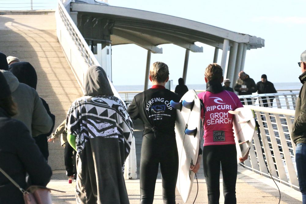 Verso la fine della giornata, il leggero calo del moto ondoso ha permesso l’ingresso in acqua dei più piccoli della categoria Junior 8-9 anni, ciascuno accompagnato da un tutor, dato che le onde erano ancora di dimensioni significative. Sono stati loro a strappare gli applausi più calorosi del pubblico, che nonostante fosse un giorno lavorativo ha affollato la punta dello splendido pontile di Lido di Camaiore.