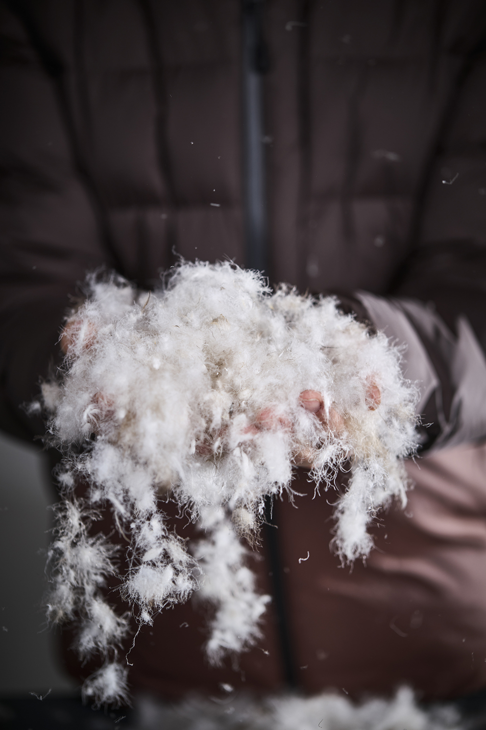 L’imbottitura in Downwool by Grüezi Bag mixa le ben note proprietà delle imbottiture in piumino con quelle della lana, dando come risultato una performance termica unica. Il blend, realizzato al 70% da piuma RDS e al 30% in lana alpina, va a formare un isolamento leggero e incredibilmente caldo, capace però di mantenere la performance anche da bagnato, grazie alle proprietà igroscopiche della lana.