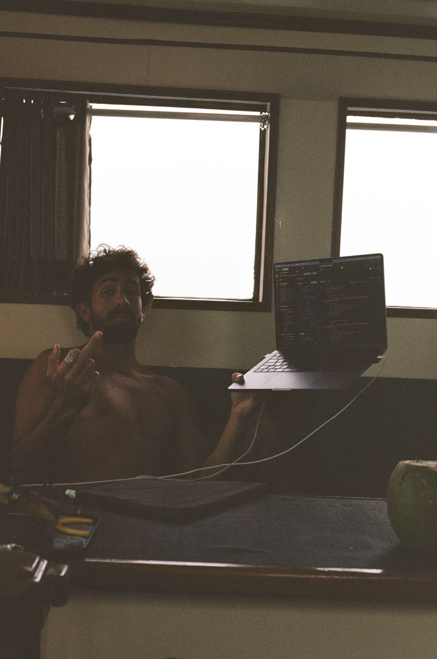 La mattina dopo, mentre Alejandro e Seppi lavoravano con i loro laptop nella lobby, venimmo a conoscenza che ci sarebbero stati altri due surfisti ad aggiungersi al nostro gruppo. Sotto sotto un po’ scocciati che non avremmo avuto la barca tutta per noi, facemmo conoscenza con Gabriel, brasiliano in cerca di tubi sinistri, e Romain, svizzero francese, coach dell’Alaia Bay in vacanza last minute.
