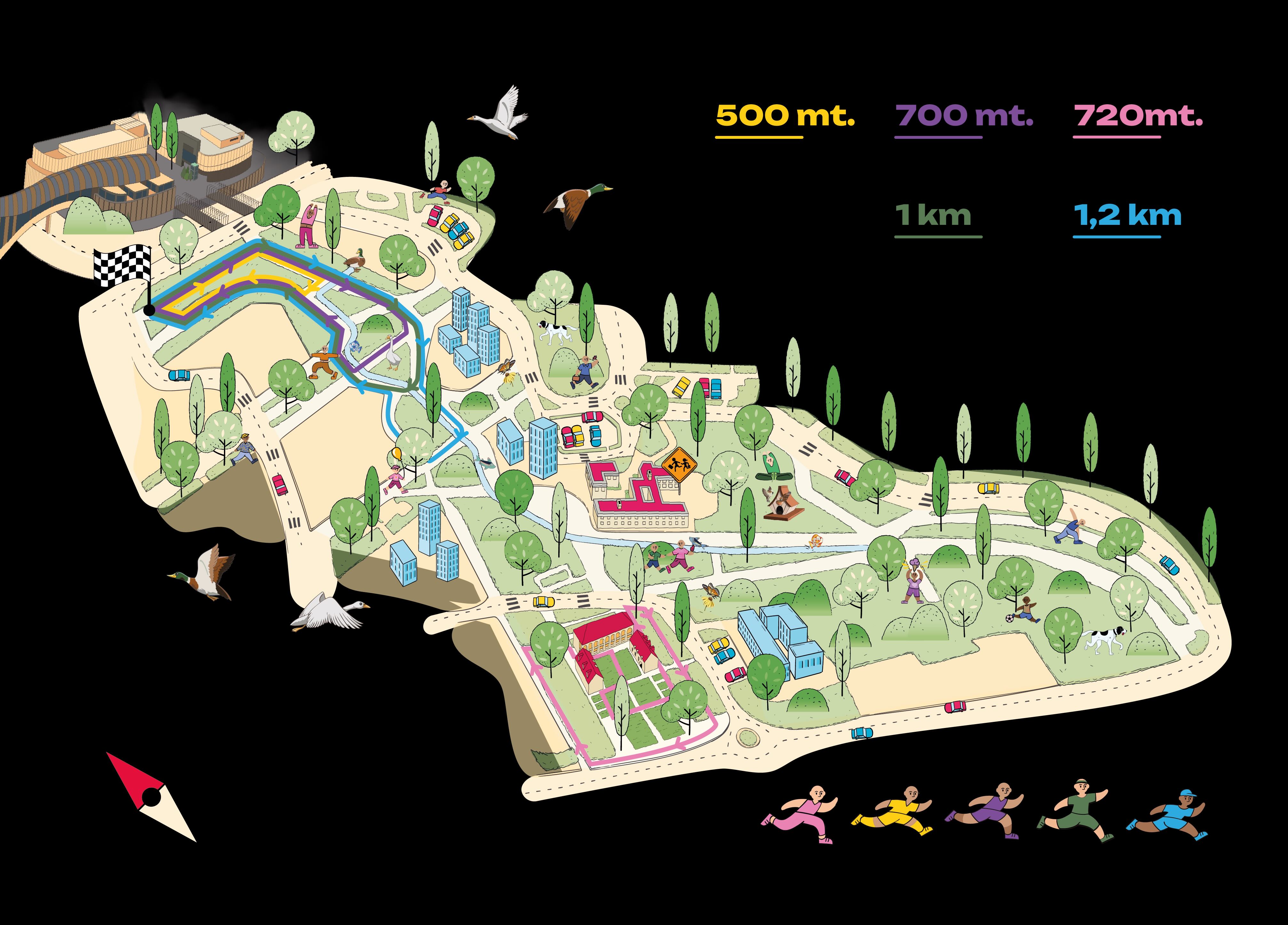 I percorsi di corsa sono stati progettati per includere tutti, bambini e adulti di ogni età. Offrendo esperienze di camminata e di corsa adatte a ogni livello di Preparazionepreparazione o esigenza di fruizione, dal gioco alla performance agonistica. Tutti segnalati con nomi e colori evocativi, che richiamano la biodiversità e l’identità del quartiere. I tracciati si snodano dall’area nord del parco tra gli spazi verdi ombreggiati, il corso d’acqua, le residenze urbane smart e i punti di ristoro nelle vicinanze: