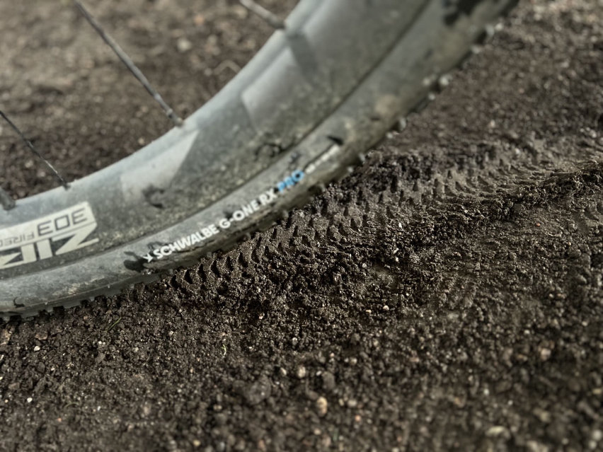 Abbiamo scelto di provare le cinque gomme cercando di riprodurre in modo quanto più realistico le tipiche situazioni in cui ci si imbatte nelle uscite invernali, con l’eccezione del fondo ghiacciato, perché le temperature non sono ancora così basse… La sezione sulla quale si è orientata la scelta è di 45 mm per tutti gli pneumatici in prova, poiché è una misura ottimale per i terreni misti e perché può essere utilizzata senza problemi di ingombro su tutte le bici gravel di ultima generazione. Il montaggio è stato fatto in configurazione tubeless, con pressione di 1,8 bar all’anteriore e 1,9 bar al posteriore (il tester pesa 70 kg) utilizzando come muletto di lusso la Wilier Rave SLR DI2, su un circuito ad anello con terreno misto. Ossia, che alterna tratti con fondo compatto e scorrevole ad altri, nel bosco, che il meteo piovoso e non troppo freddo di questo inizio di inverno ha reso umidi e un po’ fangosi.