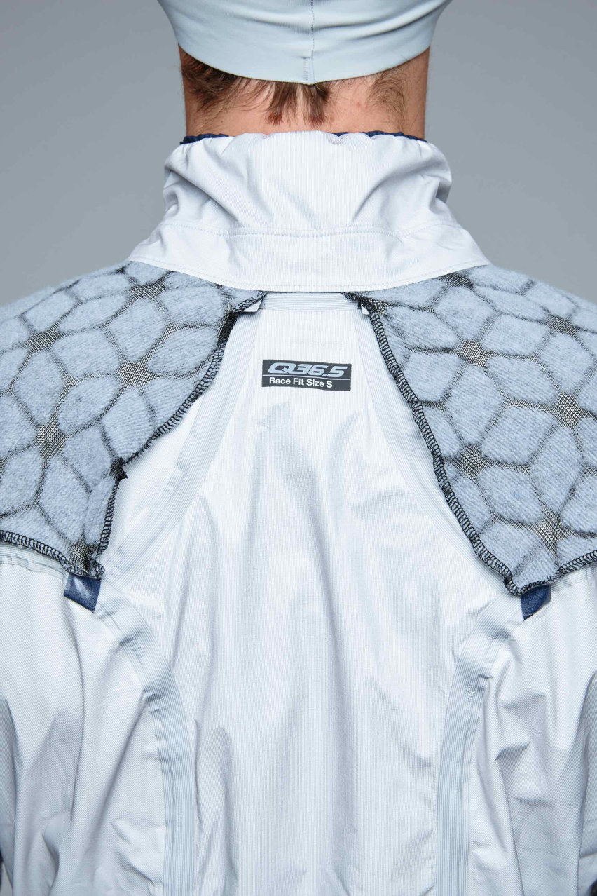 Dettagli come la zip oversize impermeabile da 8 mm, i loghi riflettenti Q36.5 e il branding “Research Scientist” richiamano la filosofia sperimentale del marchio.