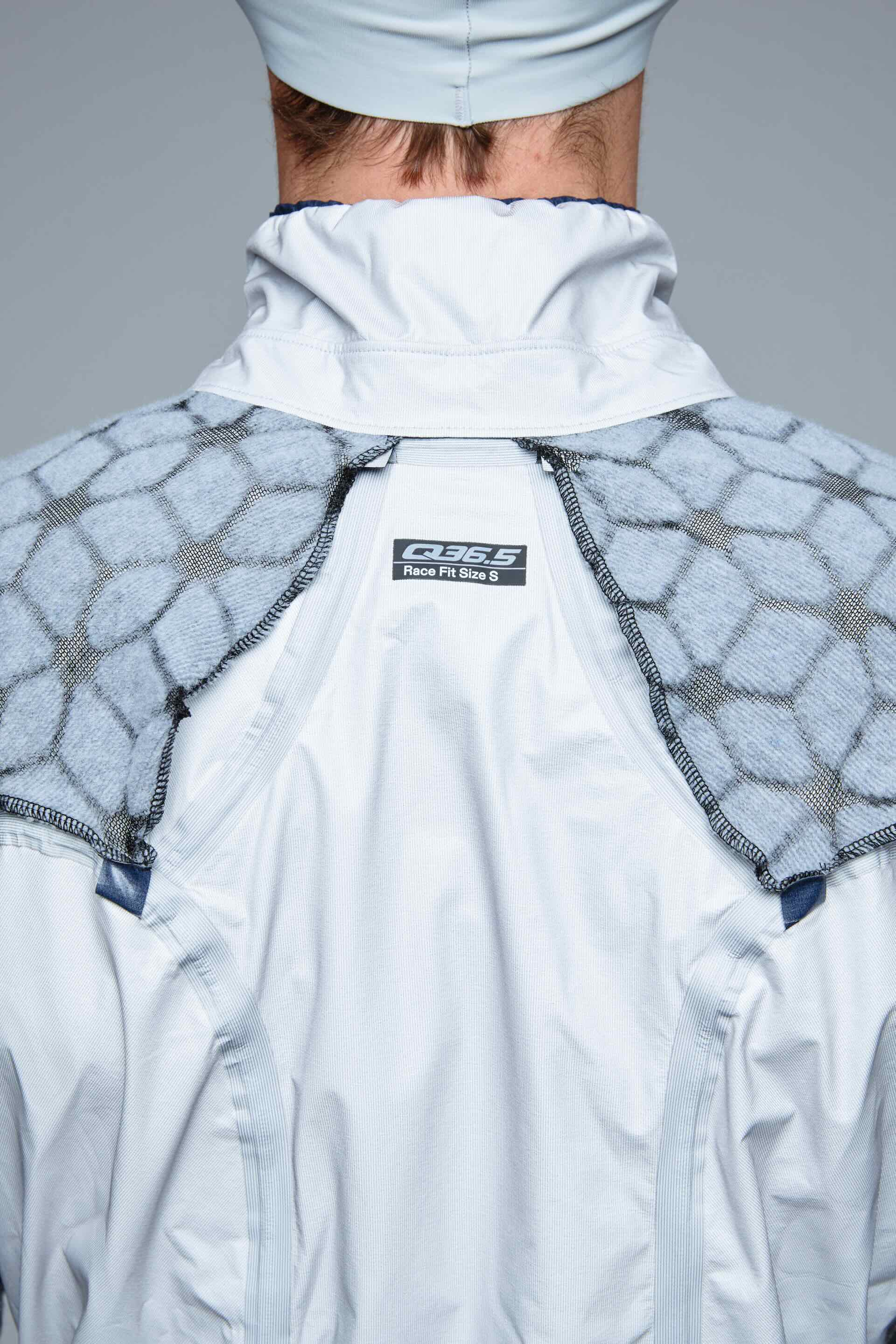 Dettagli come la zip oversize impermeabile da 8 mm, i loghi riflettenti Q36.5 e il branding “Research Scientist” richiamano la filosofia sperimentale del marchio.