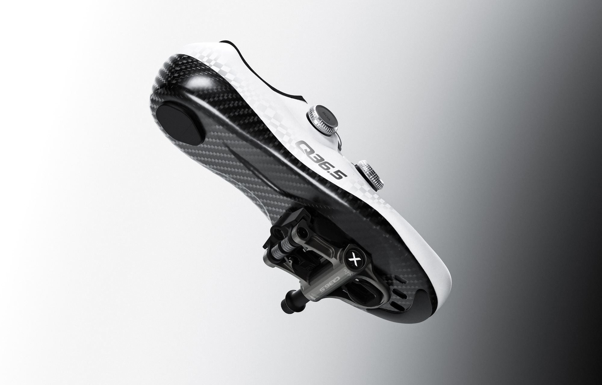 Per integrarsi nel sistema, la Q36.5 Unique Pro 4.0 (550 euro) non subisce variazioni nella costruzione, ma riceve una modifica specifica alla suola: un quarto foro aggiuntivo. Ai tre già presenti – compatibili con gli standard Look e Shimano – si aggiunge un punto di ancoraggio dedicato alla tacchetta SRM, che utilizza due punti di aggancio allineati centralmente. L’eliminazione dei fissaggi laterali ha permesso di ridurre l’altezza della tacchetta nella zona centrale e ricavare lo spazio per ospitare l’asse del pedale. Anche il pedale stesso è progettato per portare il contatto più in basso possibile.