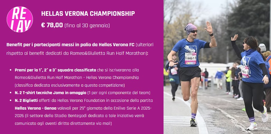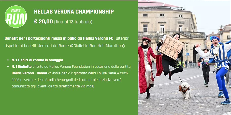Iscrivendosi alla Romeo&Giulietta Run Half Marathon, alla Relay o alla Family Run tramite la promo dedicata (attiva fino al 30 gennaio 2026), si entra automaticamente nella classifica Hellas Verona Championship e si accede ai benefit previsti per la propria distanza.