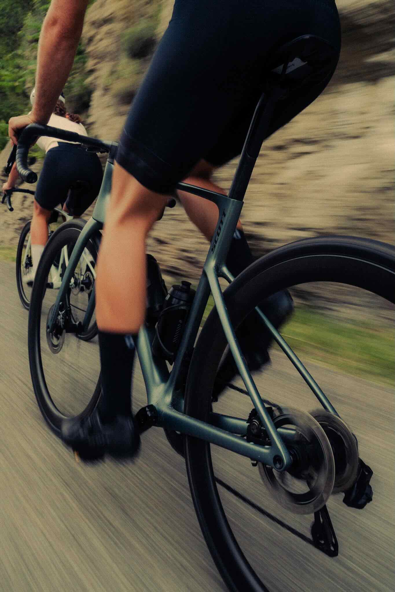Il lavoro sul telaio si è concentrato soprattutto sul tubo sella e sulla giunzione dei foderi verticali, ridisegnati per offrire un’elasticità superiore del 50 % rispetto alla precedente Addict. In pratica: vibrazioni filtrate meglio, meno fatica muscolare, più fluidità quando l’asfalto finisce per trasformarsi in “strade vissute”.