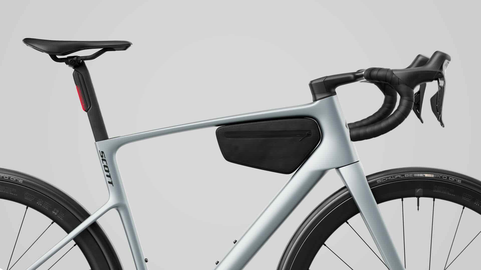 Interessanti le soluzioni pratiche integrate: il kit di riparazione nascosto nel tubo obliquo (sempre pronto, mai ingombrante) e la possibilità di montare una frame bag dedicata, elegante e facilmente accessibile. Una scelta che avvicina la Addict al mondo endurance e bikepacking, senza snaturarne le linee pulite.