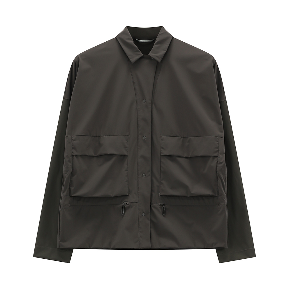 Le tasche frontali con zip invisibili completano un capo versatile, perfetto sia per la città che per l’outdoor.