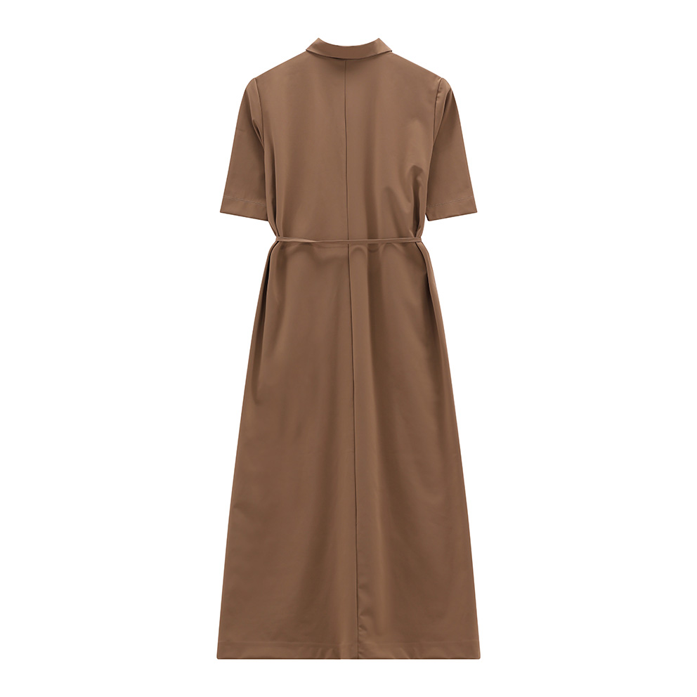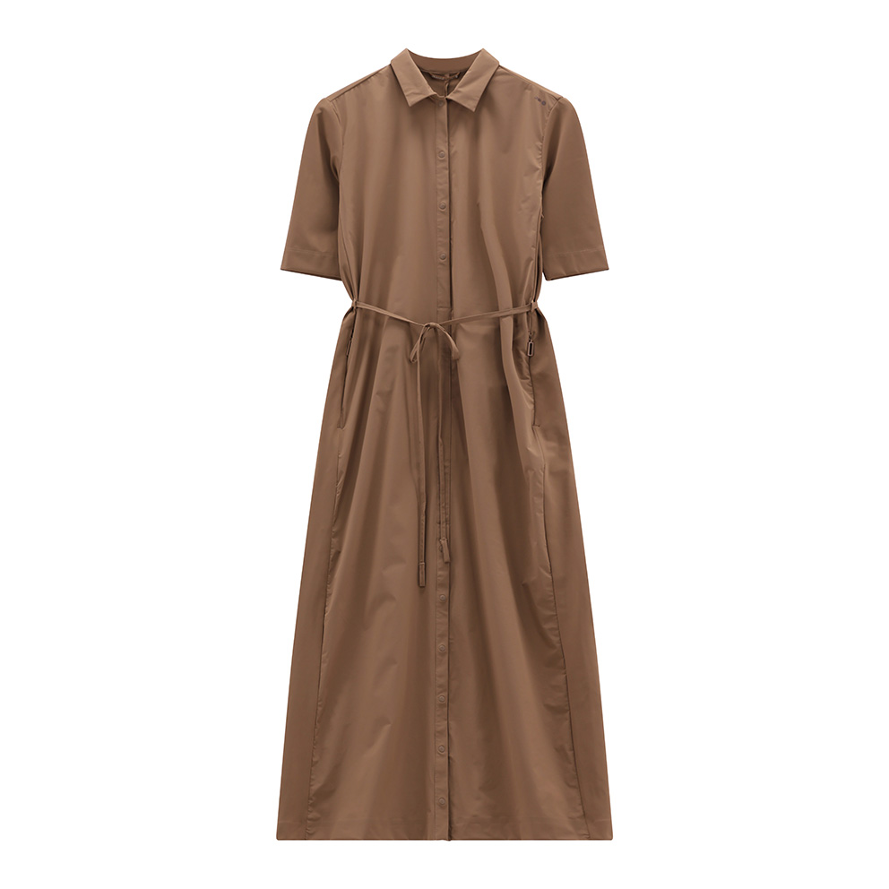 Abito chemisier in tessuto tecnico elasticizzato con inserti in interlock, cintura in vita e tasche con zip invisibili. Lo spacco frontale regolabile aumenta comfort e versatilità nei contesti urbani.
