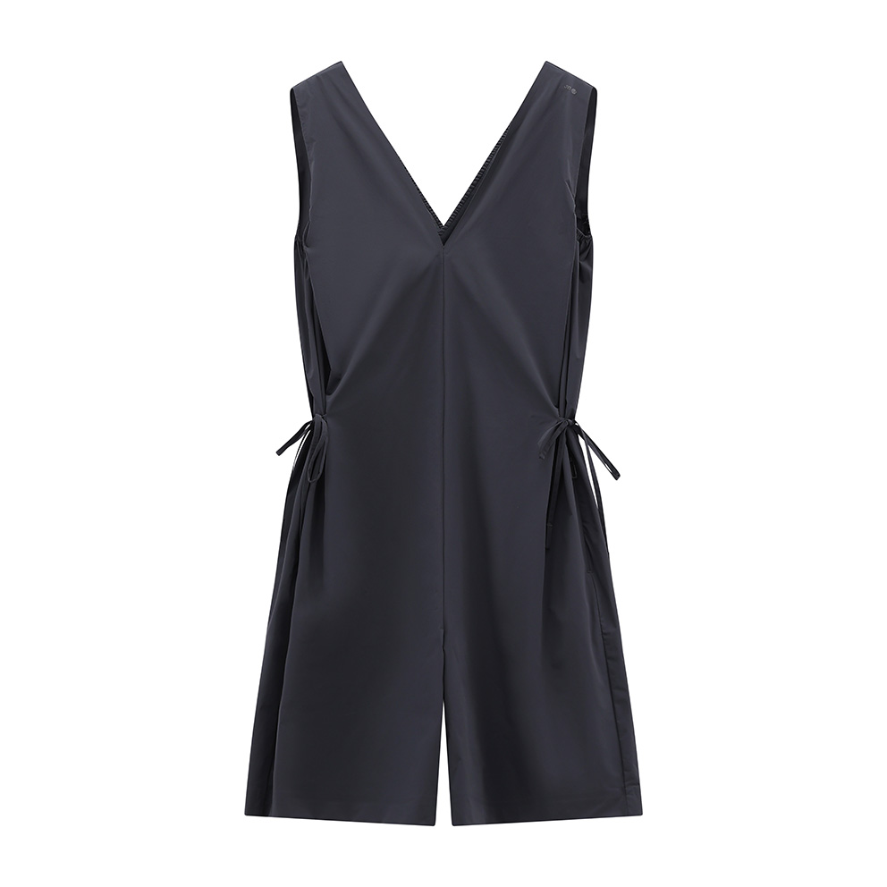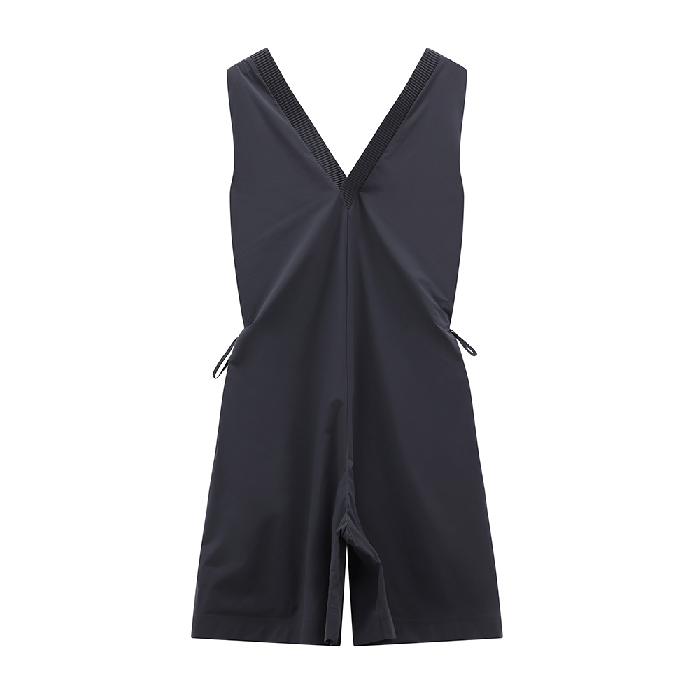 Tuta corta in tessuto 4-way-stretch, leggera, traspirante e resistente alle macchie. Presenta scollo a V, giromanica elasticizzato, tasche con zip invisibili e vita regolabile per un fit personalizzato.