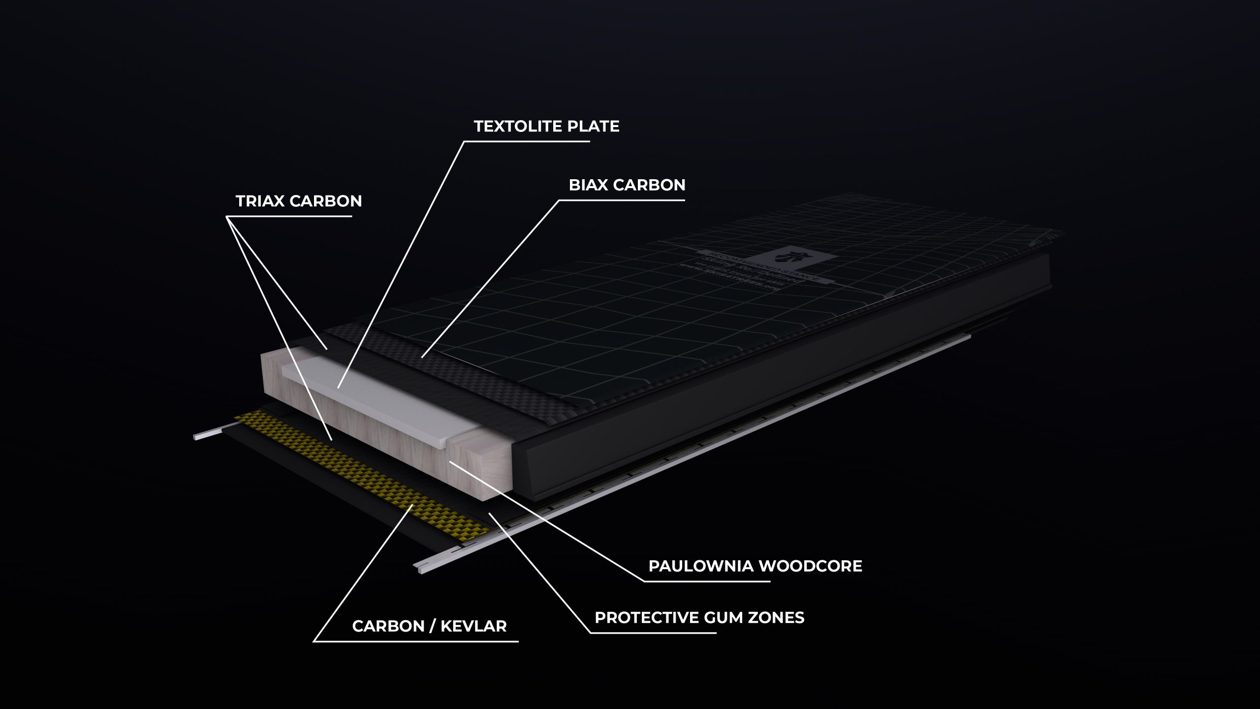 Il lay-up in biaxial carbon con fibre orientate a 0°, 30° e 45° permette di controllare con precisione flex e risposta torsionale, mantenendo la rigidità necessaria quando la velocità aumenta.