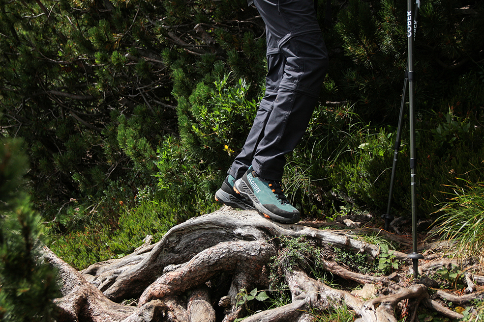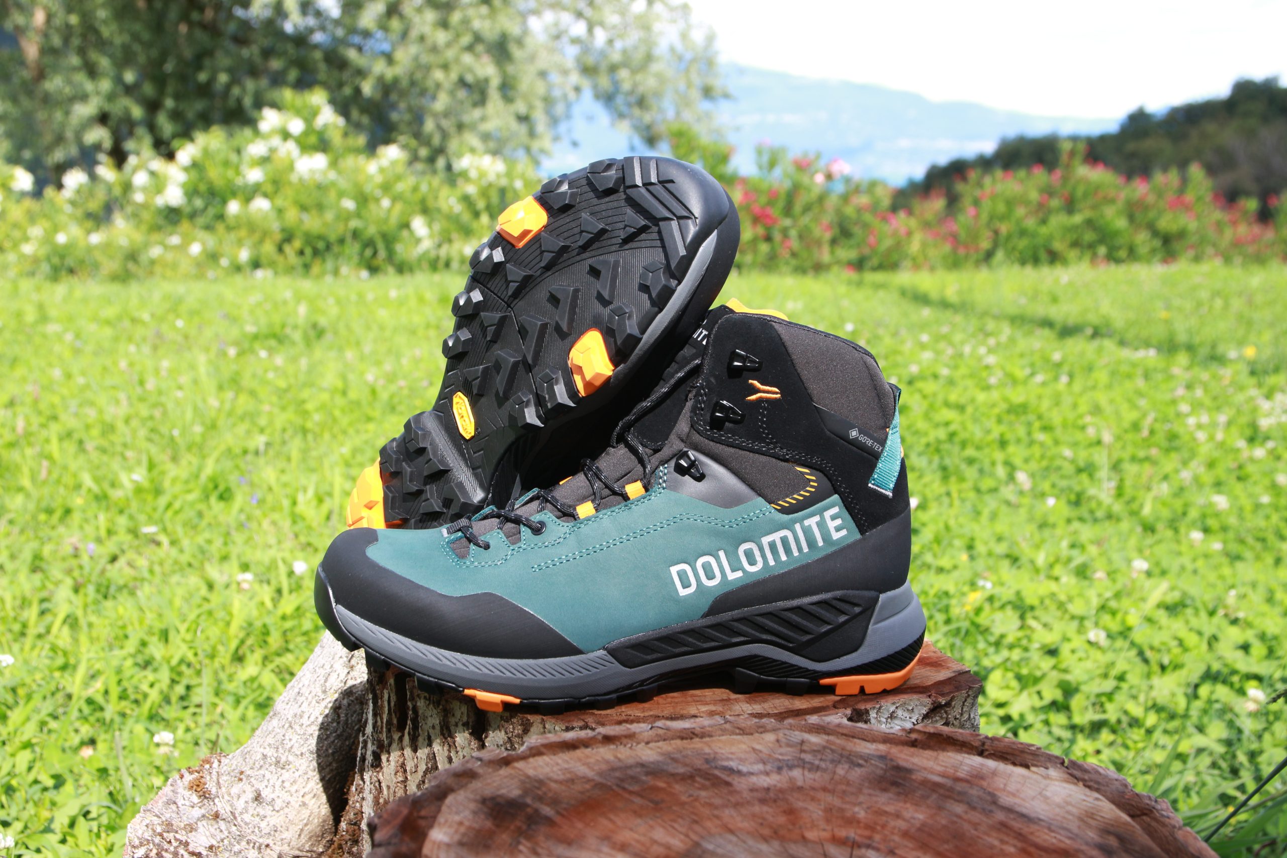 La fodera in GORE-TEX è una garanzia: ho affrontato un breve tratto sotto la pioggia e, nonostante il terreno fosse bagnato, i piedi sono rimasti asciutti e ben isolati. Il bassistrada Vibram Megagrip non perde un colpo, su calcare ha un’aderenza esagerata e il disegno consente di grippare anche su erba e terra. Mi ha colpito anche l’intersuola per il giusto equilibrio tra ammortizzazione e spinta: sembra davvero che ti accompagni passo dopo passo.